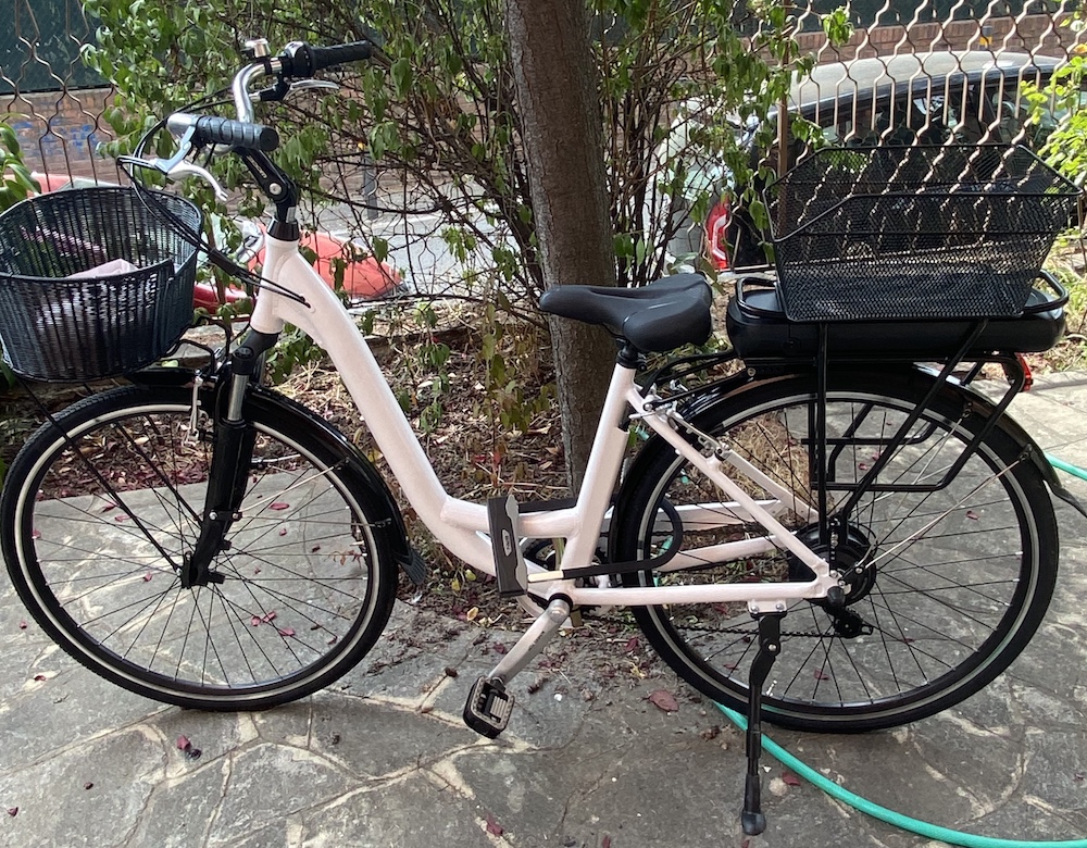 Bicicletta a pedalata assistita praticamente nuova, telaio bianca senza scritte di marca, cambio Shimano a 7 velocità, sellino nero, cestino anteriore