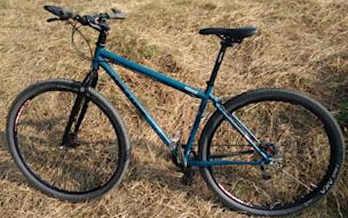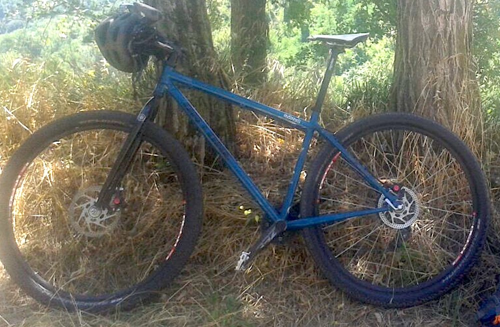 Bici ibrida, telaio blu/verde, freni a disco, la foto più recente è quella con sella bianca; Bici avvistata in zona Saffi venerdì 16 Aprile tardo pomeriggio