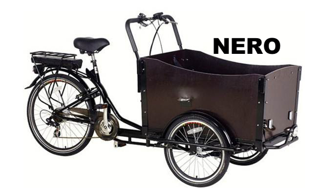descrizione / segni particolari: Cargo bike elettrica a 4 posti - due panchette. E' come quella in foto tranne per il colore del cassone TUTTO NERO. L'impianto elettrico è stato da me rimaneggiato e al manubrio è presente un selettore per frecce come quello in foto, il faro anteriore è tondo led, un clackson a tromba si intravede sotto il cassone, una scatola e molti cavi elettrici ingombrano il pannello davanti alle gambe del guidatore, un vano batteria supplementare, non visibile, è sotto al cassone. No freni a disco (anche se le ruote davanti sono state sostituite con cerchi predisposti per montare i dischi), alcuni raggi rotti nella ruota posteriore. Archetti e capottina usurata inclusi, se ancora presenti. Blocca ruota alla ruota posteriore.