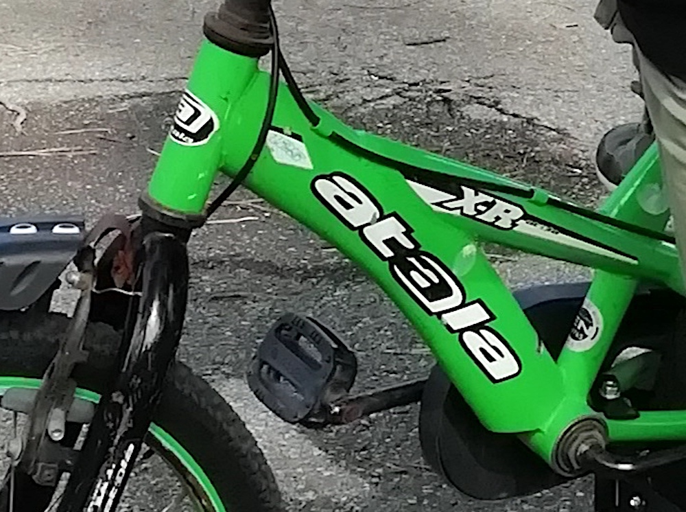 Mountain bike da bambino ruote da 16", telaio verde con la scritta ATALA in bianco, forcella nera, cerchi neri, campanello arancione, sellino nero nuovo, copertoni marca B-Twin