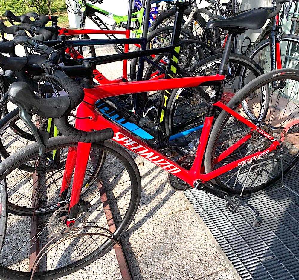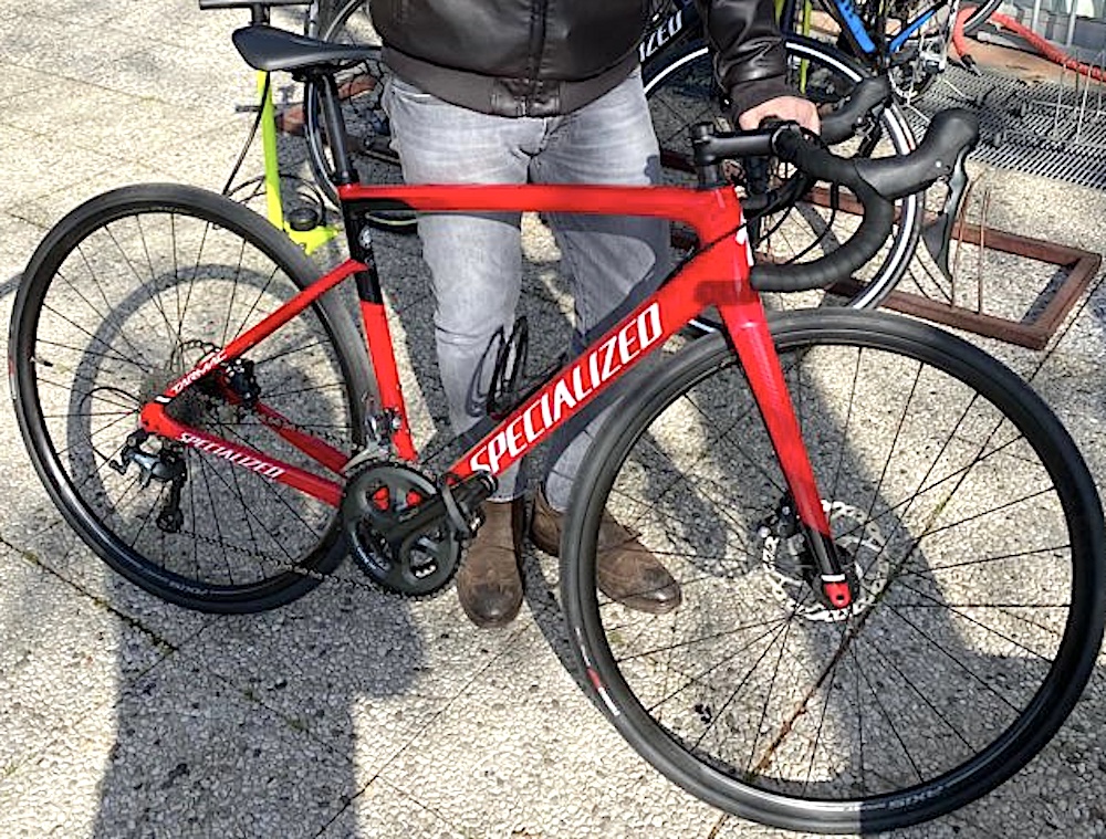 nuova bici da corsa, telaio rosso con la scritta SPECIALIZED in bianco, forcella dritta in carbonio, freni a disco
