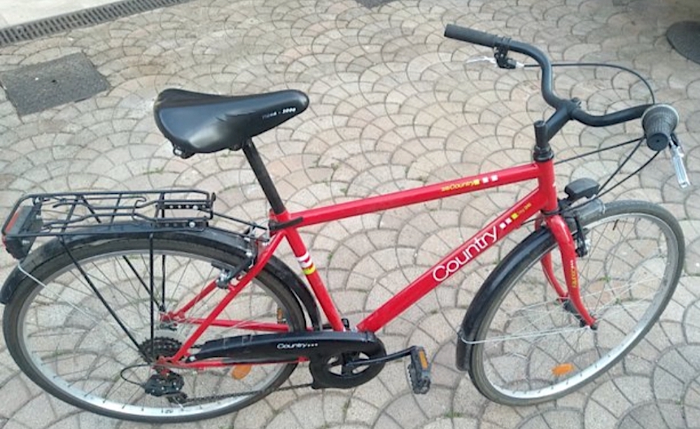 City bike da uomo con cambio, telaio rosso con la scritta COUNTRY in bianco, carter catena e parafanghi neri, portapacchi posteriore nero