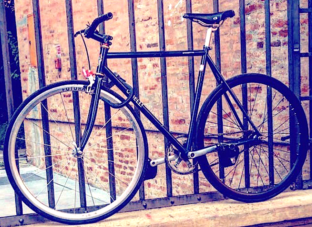 Telaio blu scuro con la scritta CINELLI e GAZZETTA in bianco, scatto fisso modificata e con freno anteriore bianco, due cerchi diversi quello posteriore nero