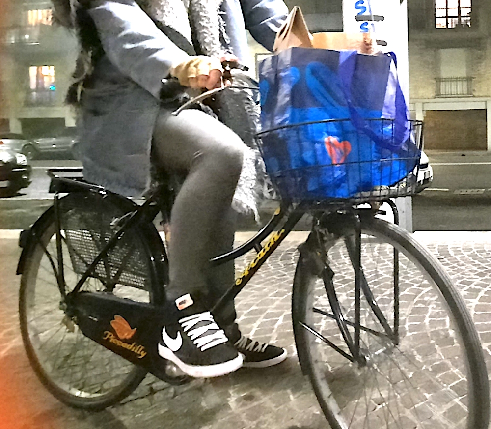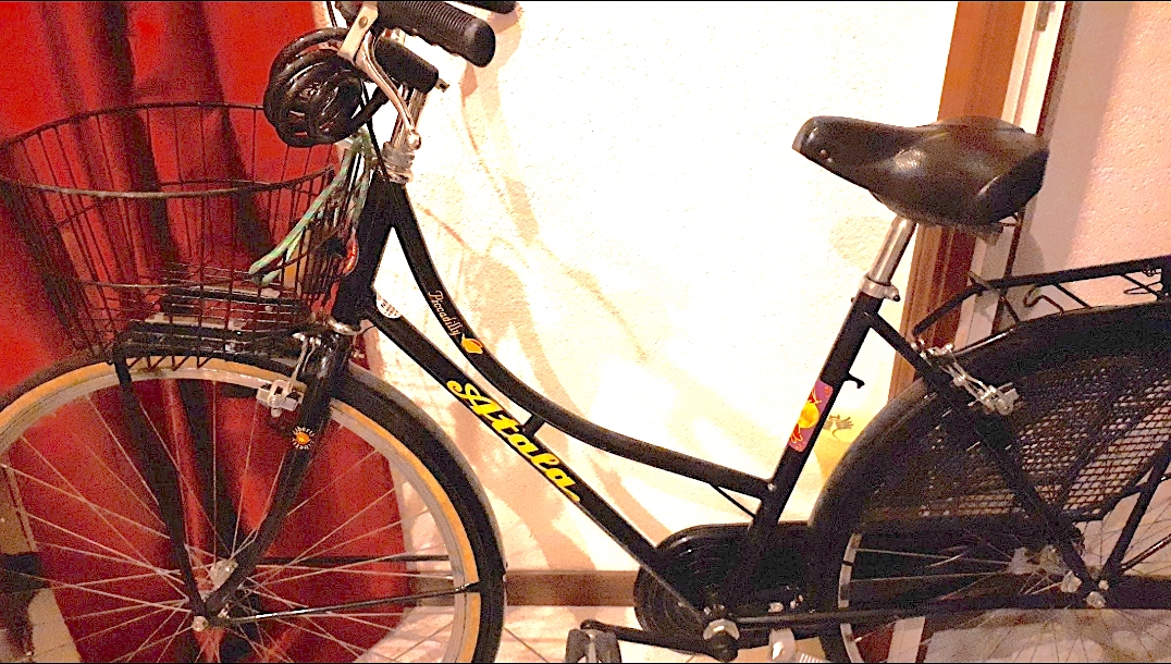 city bike, telaio nero con le scritte ATALA e Piccadilly in giallo, campanellino rosa metalizzato rotto, due portapacchi neri