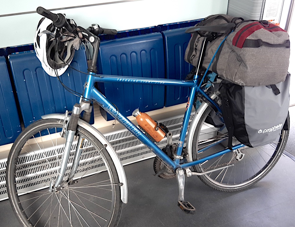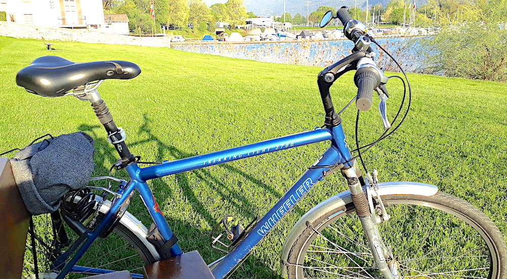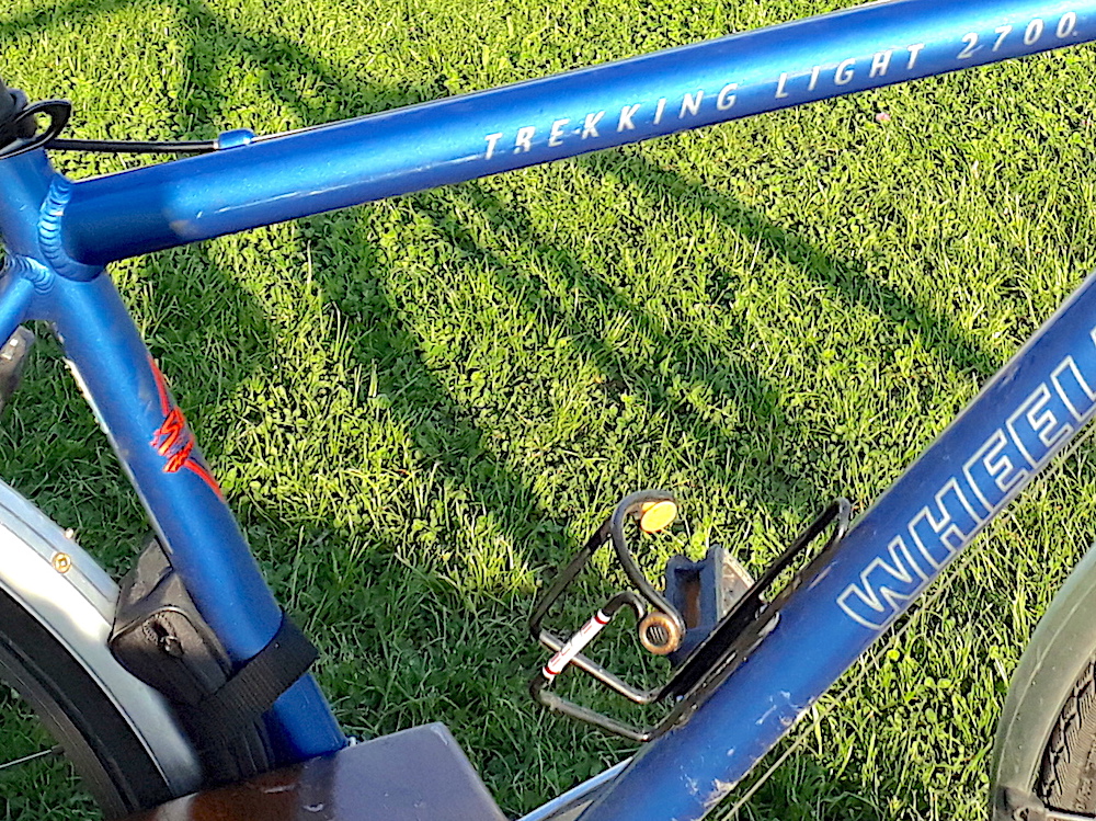 Bici ibrida città / trekking, telaio blu con le scritte WHEELER e TREKKING LIGHT 2700 in bianco, forcella argento ammortizzata, attacco manubrio nero regolabile, portapacchi posteriore, parafanghi grigi, cavo rotto in fronte, doppio cambio