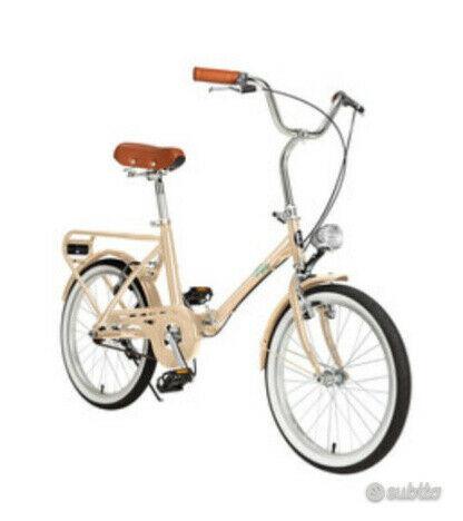 Bici pieghevole tipo graziella moderna, telaio beige con la scritta LA MIA, senza cestino (che avevo appena tolto), due catene una bianca attorno al sedile