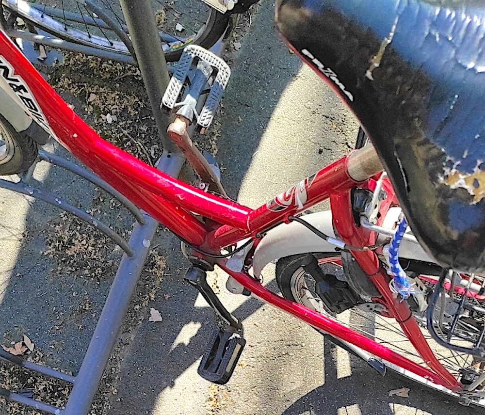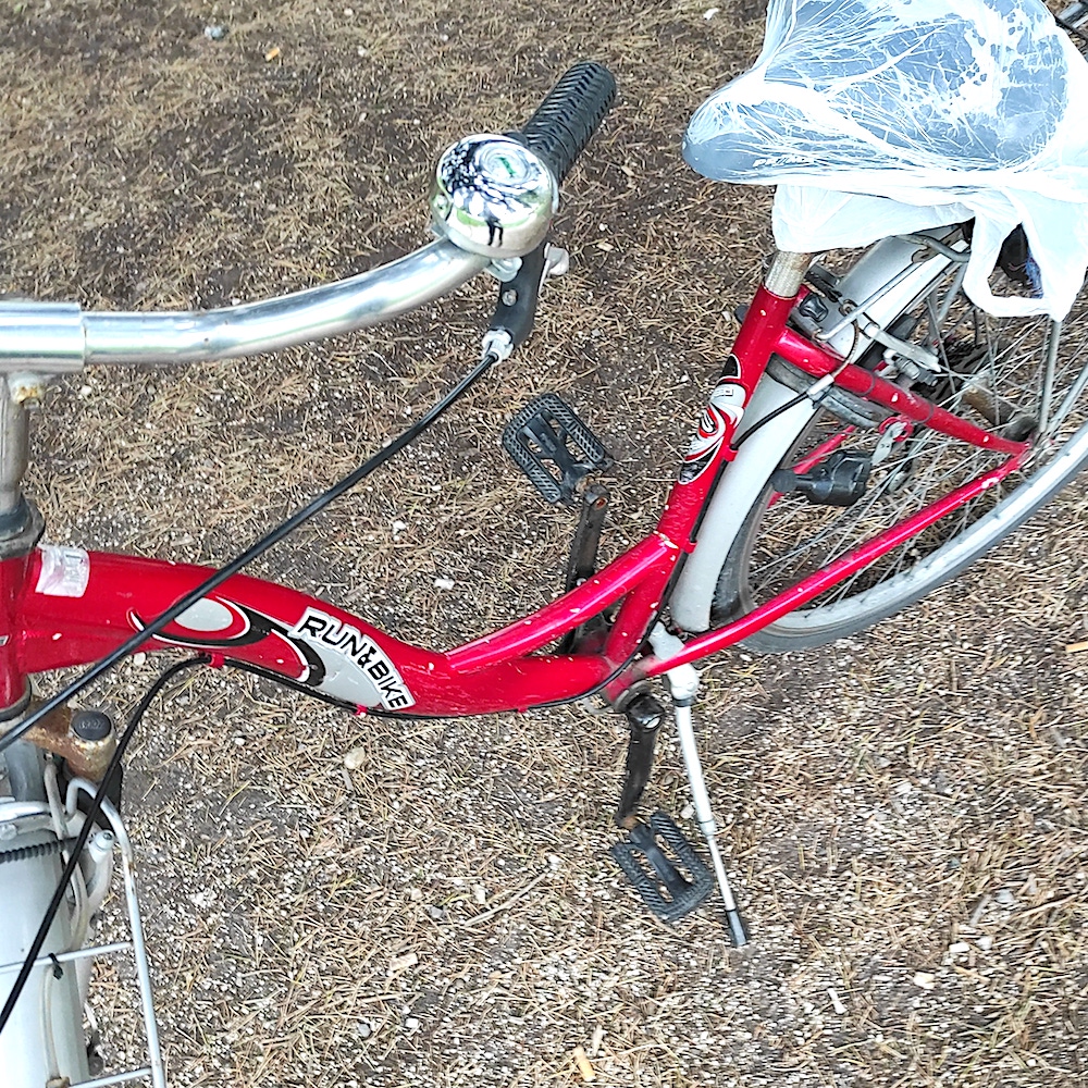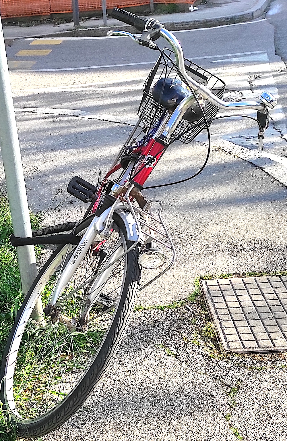 descrizione / segni particolari: City bike da donna con cambio, telaio rosso con la scritta RUN & BIKE in nero, forcella ammortizzata, freno destro funziona male, manca carter catena, sellino consumato con la spugna visibile, cestino nero sul portapacchi posteriore, luce davanti staccata e penzolante