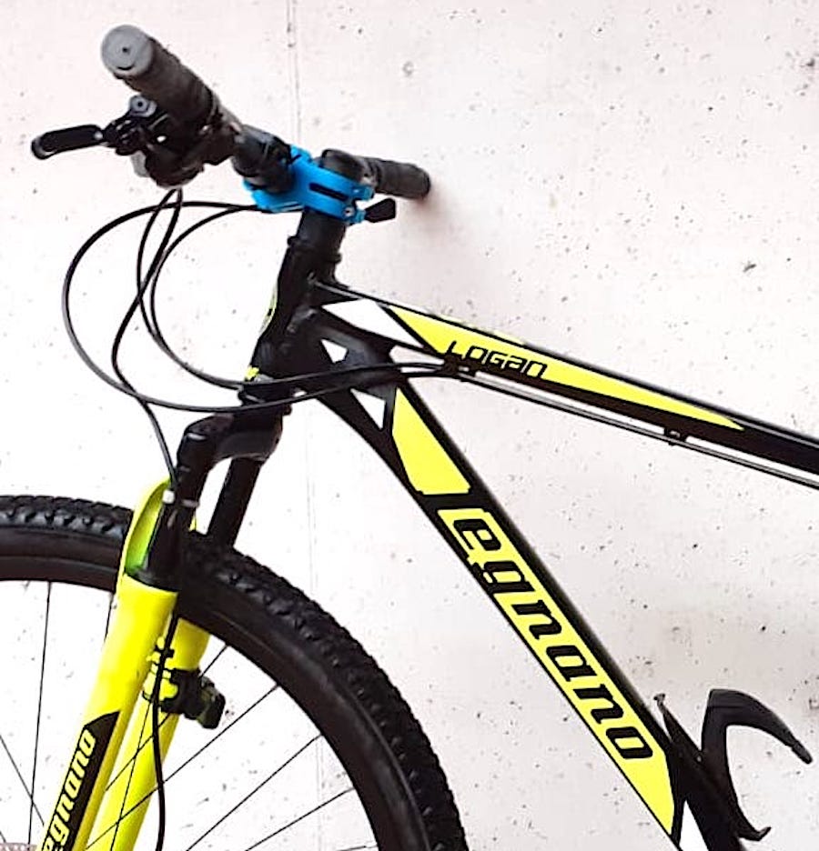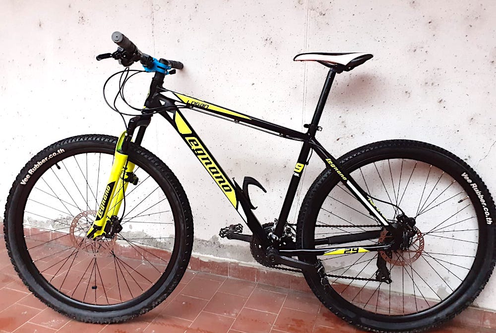 mountain bike, telaio nero e giallo con le scritte LEGNANO e LOGAN in nero, forcella ammortizzata, freni a disco, attacco manubrio blu, cerchi raggio 29'', scritta sotto i pedali "taglia L", portaborraccia nera