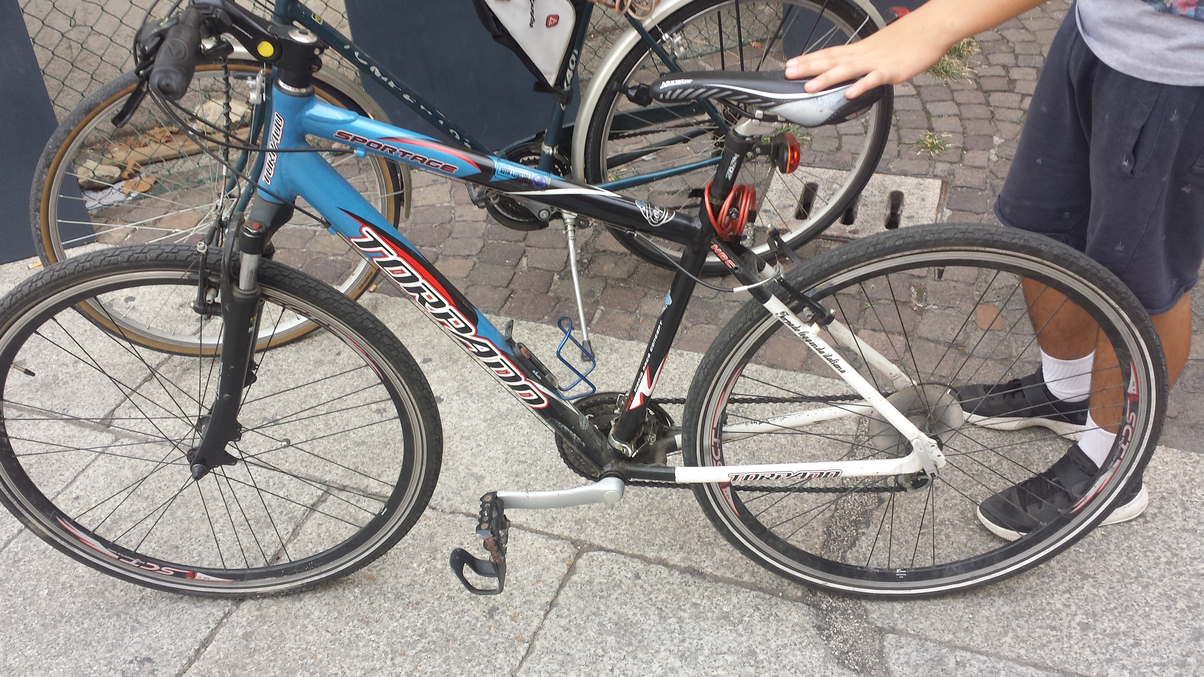 mountain bike, telaio blue nero e bianco, forcella nera ammortizzata, munita di luci LED sotto sella, marchiatura sul tubo superiore
