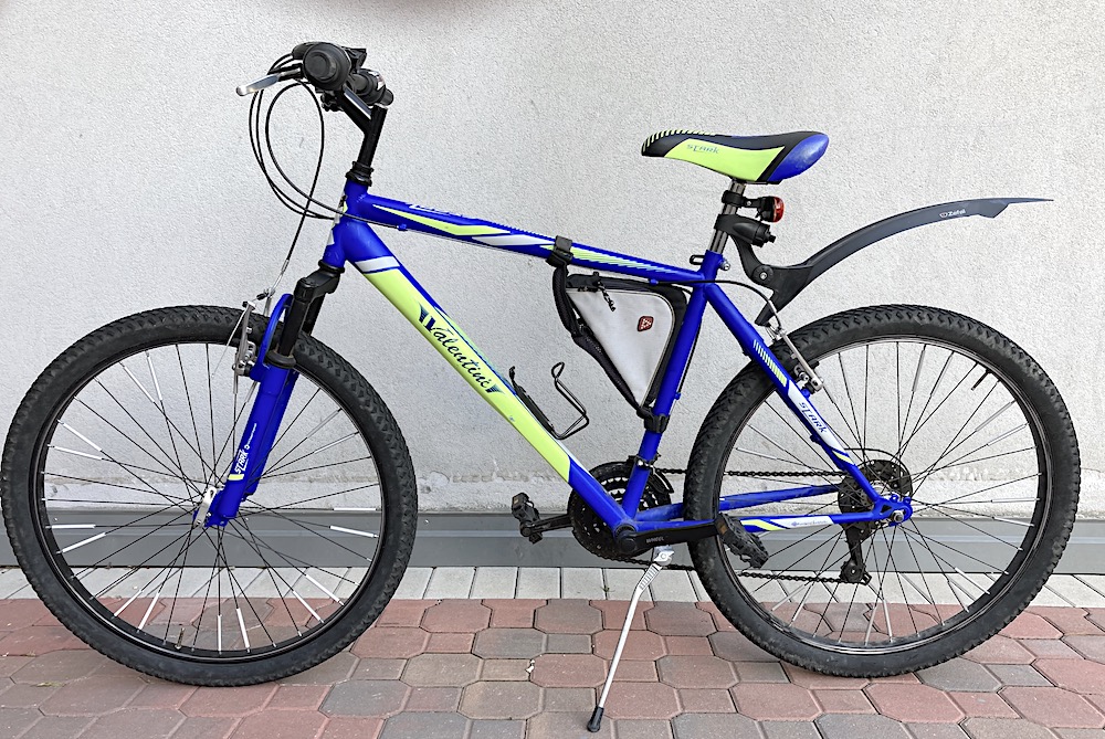 mountain bike, telaio blu e giallo con le scritte VALENTINI in blu e STARK in bianco, forcella blu ammortizzata, sellino nero giallo e blu, munita di luci LED e accessori, cerchi neri, cavalletto