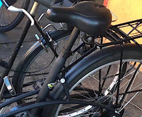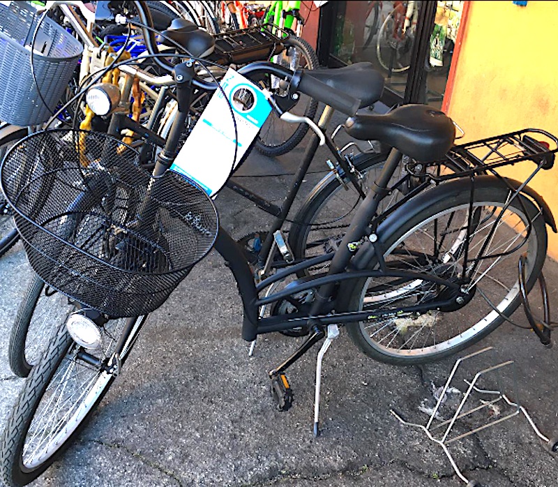 City bike da donna, telaio nero opaco, 5 marce, cestino anteriore di colore con un po’ di ruggine e portapacchi posteriore