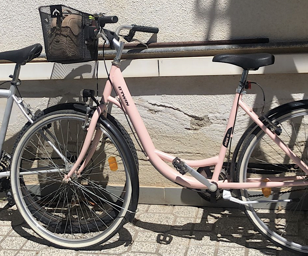 descrizione / segni particolari: City bike da donna, telaio rosa con la scritta B'TWIN in nero e ELOPS 100 in rosa su nero, cestino nero avanti, parafanghi neri, campanello sul manubrio, attacco del cestino al manubrio di colore nero, luce catarifrangente al tubo reggisella, luce anteriore sopra il parafango