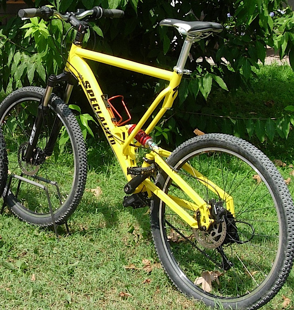 descrizione / segni particolari: Mountain bike costruita a mano da telaio non commerciale acquistata direttamente dalla fabbrica, telaio giallo doppio ammortizzato, freni a disco, ammortizzatore centrale rosso scuro, forcelle RST nera, attacco manubrio Ritchey, pompe, mozzi Shimano, sellino Velo