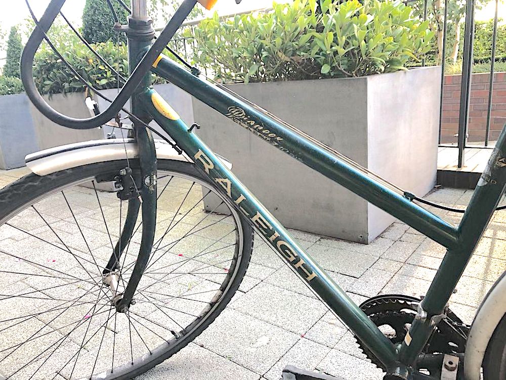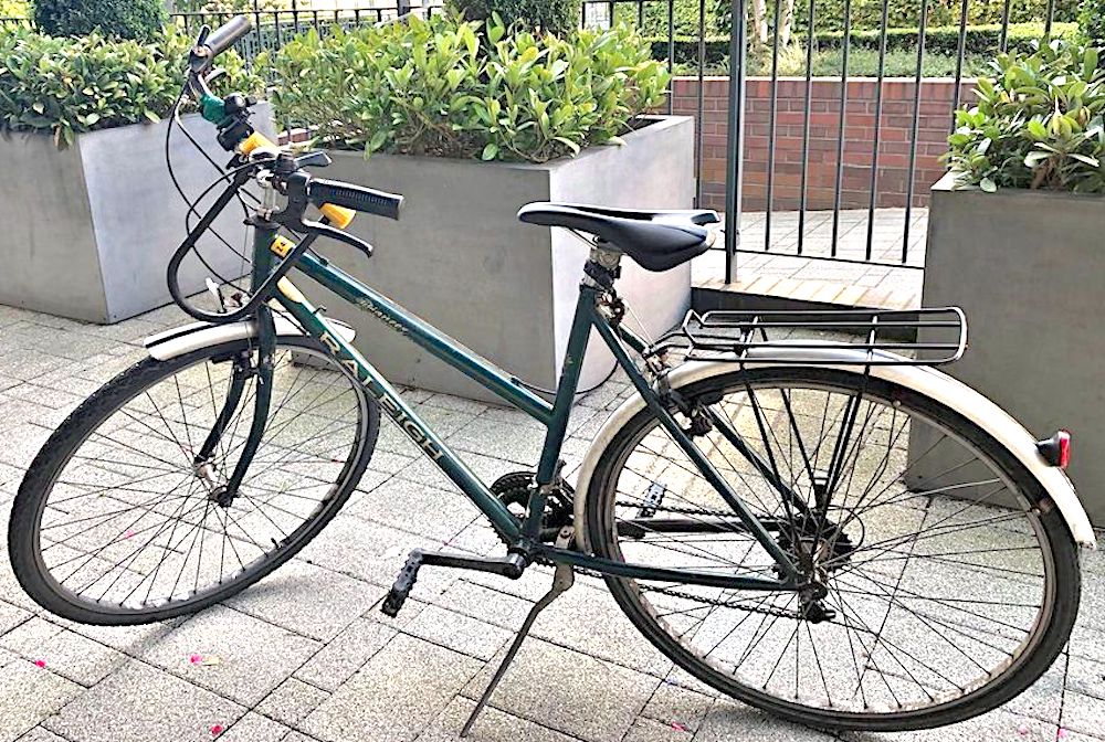 City bike da donna con cambio, telaio verde con le scritte RALEIGH colore oro, parafanghi argento, portapacchi posteriore nero, desivo giallo sulla parte anteriore con un numero di serie.