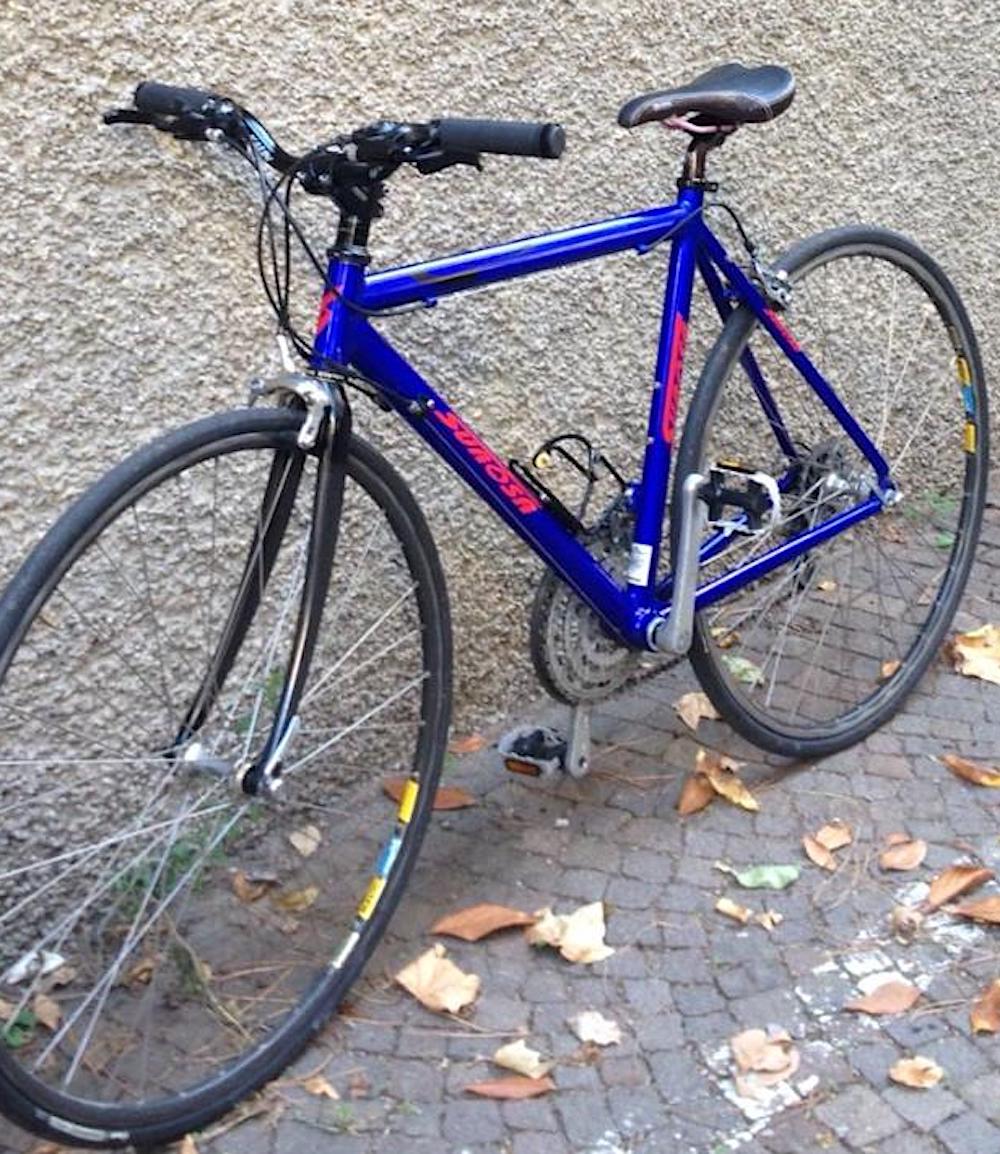 Bici acquistata a Londra, telaio colore blu elettrica di taglia piccola, forcella anteriore nera, scritta sul telaio SUROSA in rosa, cerchi MAVIC, sellino marca CHARGE, portaborracce nera con pezzi gialli, cambio Shimano 3x7