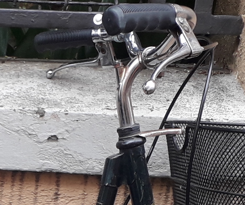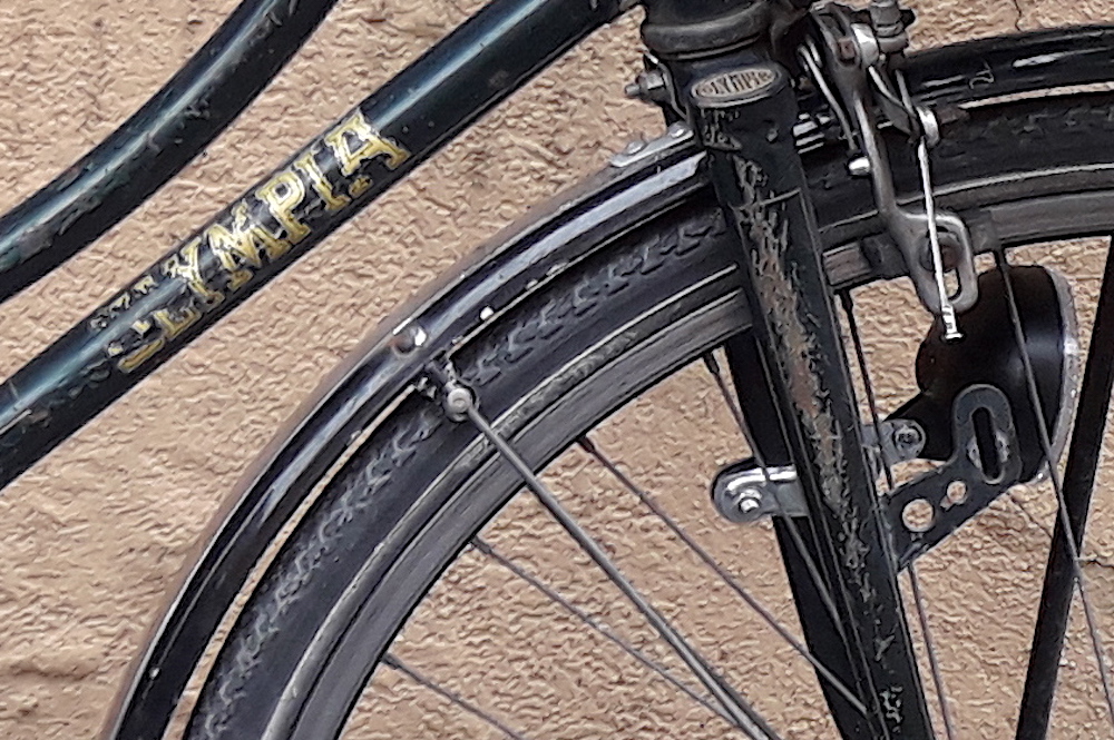 Vecchia city bike da donna, telaio verde scuro con le scritte OLYMPIA colore oro, carter catena chiuso, parafanghi, due portapacchi, cestino anteriore, fanali e dinamo, attacco manubrio particolare