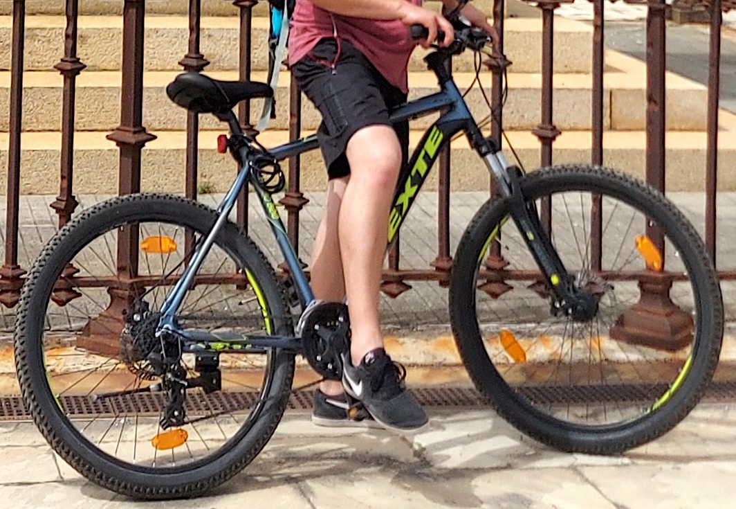 montano bike, telaio grigio con le scritte EXTE in giallo, forcella ammortizzata, freni a disco, senza fanali e parafanghi