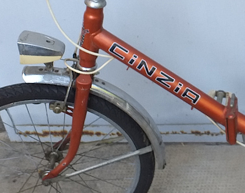 bici pieghevole tipo graziella, telaio colore arancione metallizzato, campanello argento, portapacchi integrato, sella nera marca BRN con righe arancioni, carter catena cromato, pedali bianchi, fanale solo davanti