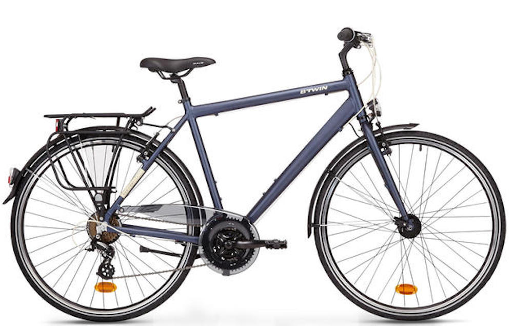 city bike da uomo con cambio, telaio girgio/blu con la scritta B-Twin in bianco, aveva una grossa catena rossa attorno al canotto