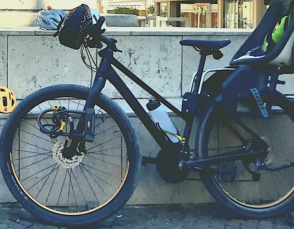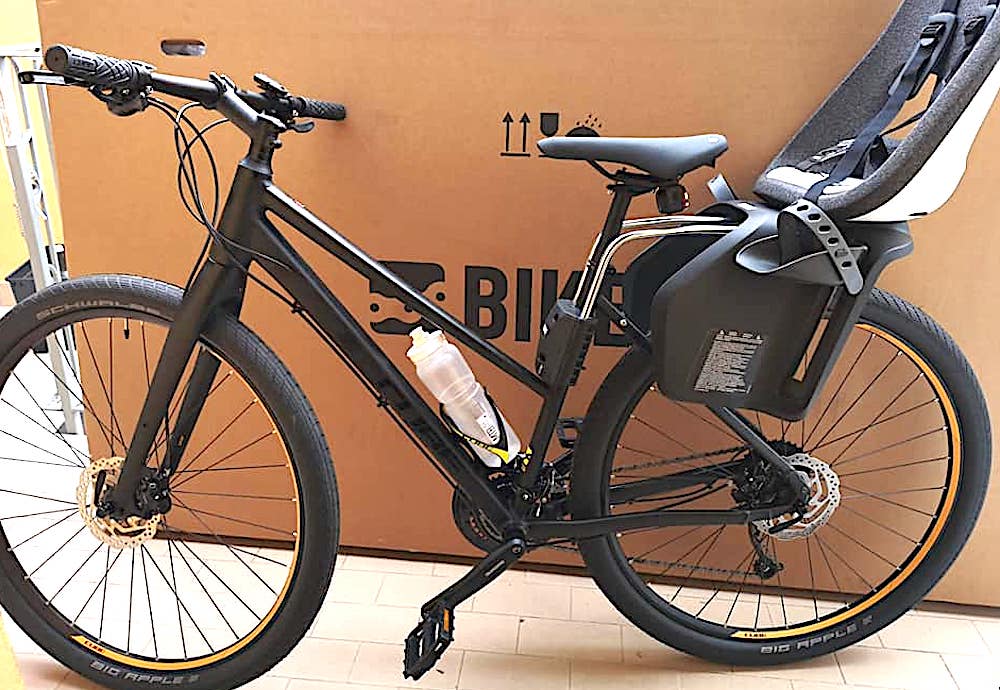 descrizione / segni particolari: Bici ibrida, telaio da donna tutto nero opaco, freni a disco, ruote 29", supporto al tubo sella per seggiolino marca Thule come da foto (il seggiolino me l'hanno lasciato), supporto per borsa nel manubrio, luce anteriore attaccata sul manubrio, cavalletto posteriore cube, piccolo telecomando nero attaccato sul manubrio per allarme, luce dietro sella, marca Abus, portaborracce nera e gialla, cerchi con striscia gialla, copertoni Schwalbe Big Apple |