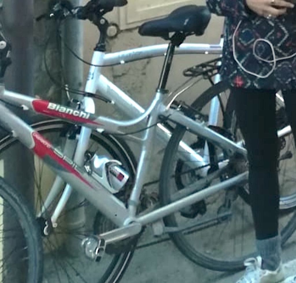 descrizione / segni particolari: Telaio particolare da donna argento con le parti in rosso e le scritte BIANCHI e SPILLO in bianco, forcella anteriore ammortizzata, cestino anteriore in metallo nero, portapacchi posteriore, sellino nono originale nero super imbottito, pedali non originali in acciaio grigio metallizzato, portaborraccia in plastica bianco, campanello rosso