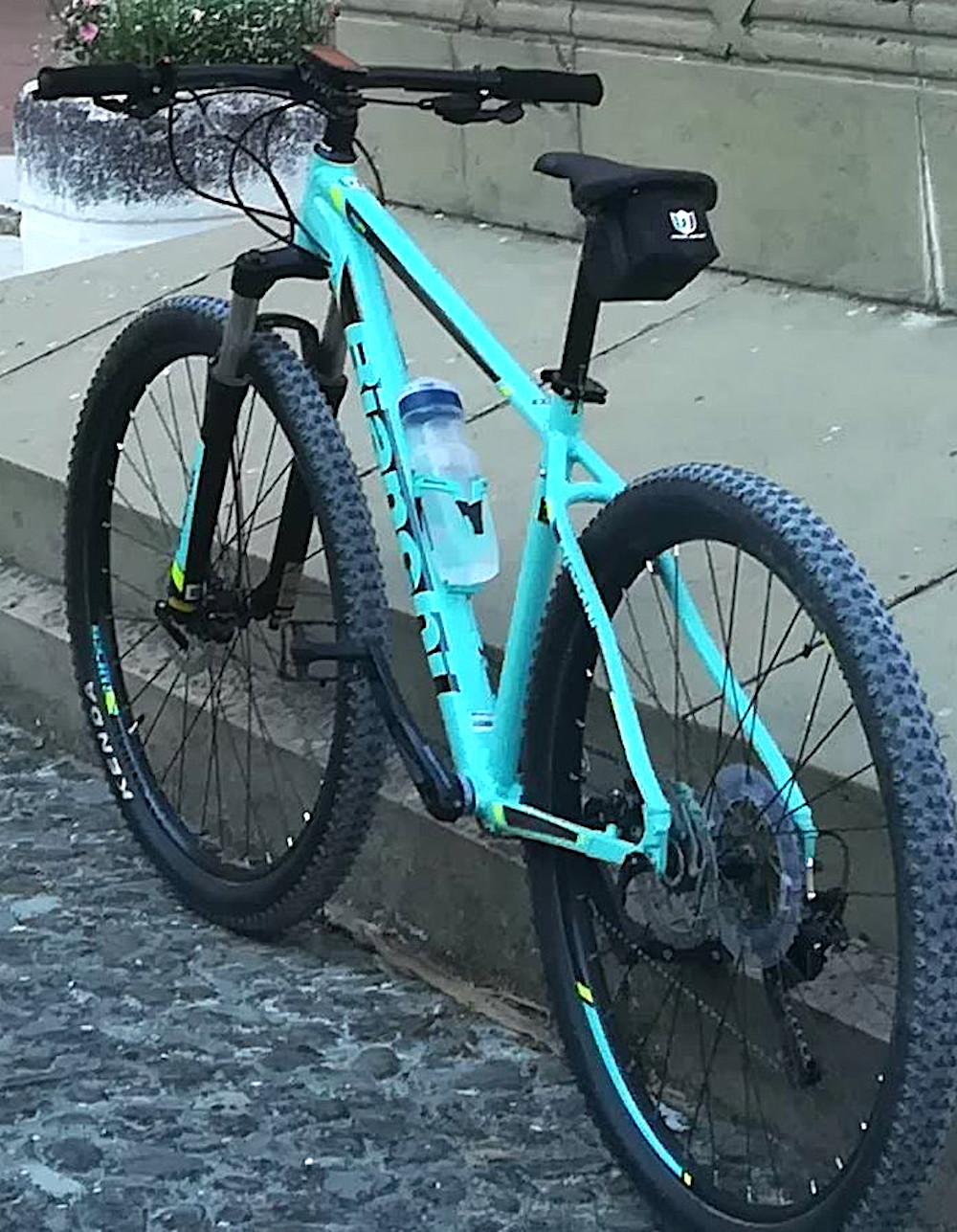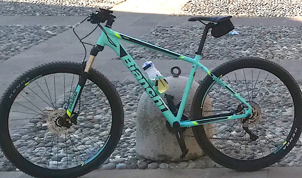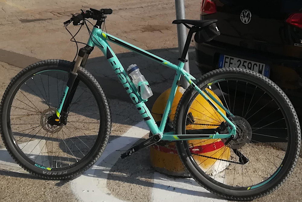 descrizione / segni particolari: Mountain bike, telaio verde taglia L con la scritta BIANCHI in verde, forcella anteriore nera ammortizzata marca SunTour XCR, freni a disco, cambio Shimano Deore, ruote da 29", comando sgancio sospensione anteriore non originale (sostituito causa rottura), manopole manubrio non originali (spugna nera), Marcata da con logo venditore (SOMEC) documento di acquisto in mio possesso