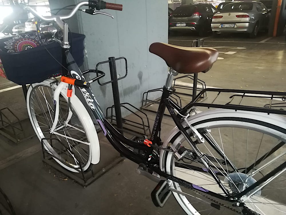 city bike da donna con cambio, telaio nero con la scritta CINZIA e LIBERTY BIKE in bianco, sellino e manopole marrone, parafanghi bianchi, copertoni neri con larga striscia bianca, due portapacchi, cestino anteriore