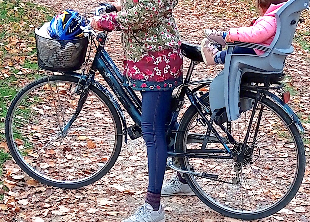 city bike da donna, telaio riverniciato blu e nero, due portapacchi, seggiolino montato dietro con attacco al tubo sella, cestino nero davanti, cavalletto con piede nero
