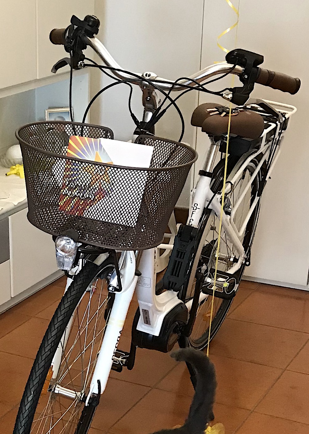 bici elettrica, telaio da donna bianco con el scritte CINZIA e SFERA in nero, forcella ammortizzata, sellino e manopole marrone, cestina davanti, supporto per lucchetto pieghevole sul tubo sella