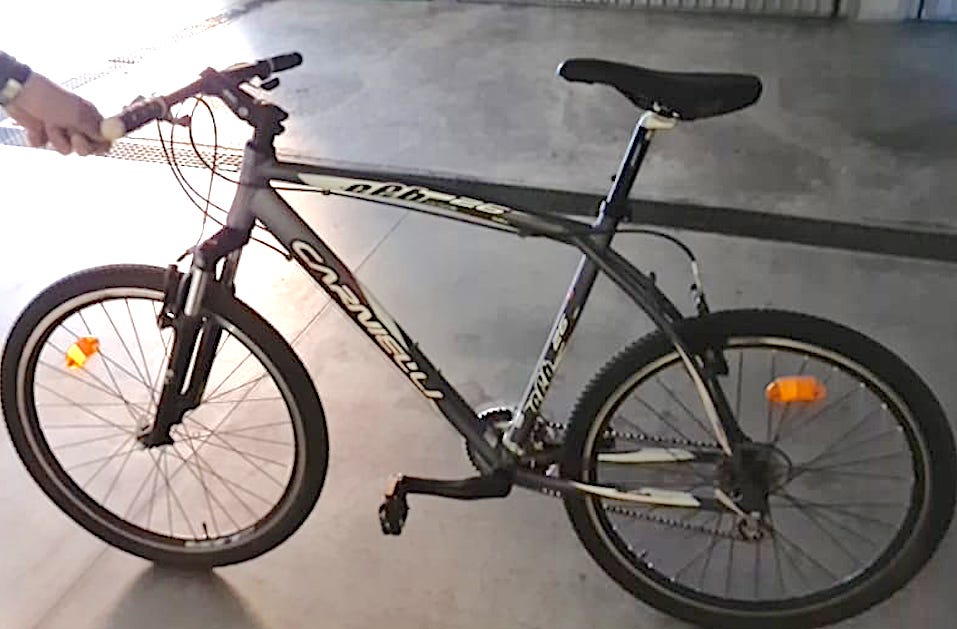 descrizione / segni particolari: mountain bike, telaio grigio con le scritte CARNIELLI in bianco, manubrio nero con la scritta HI-TECH in bianco, forcella anteriore nera ammortizzata, cerchi neri, attacco manubrio regolabile, due denti della corona leggermente piegati