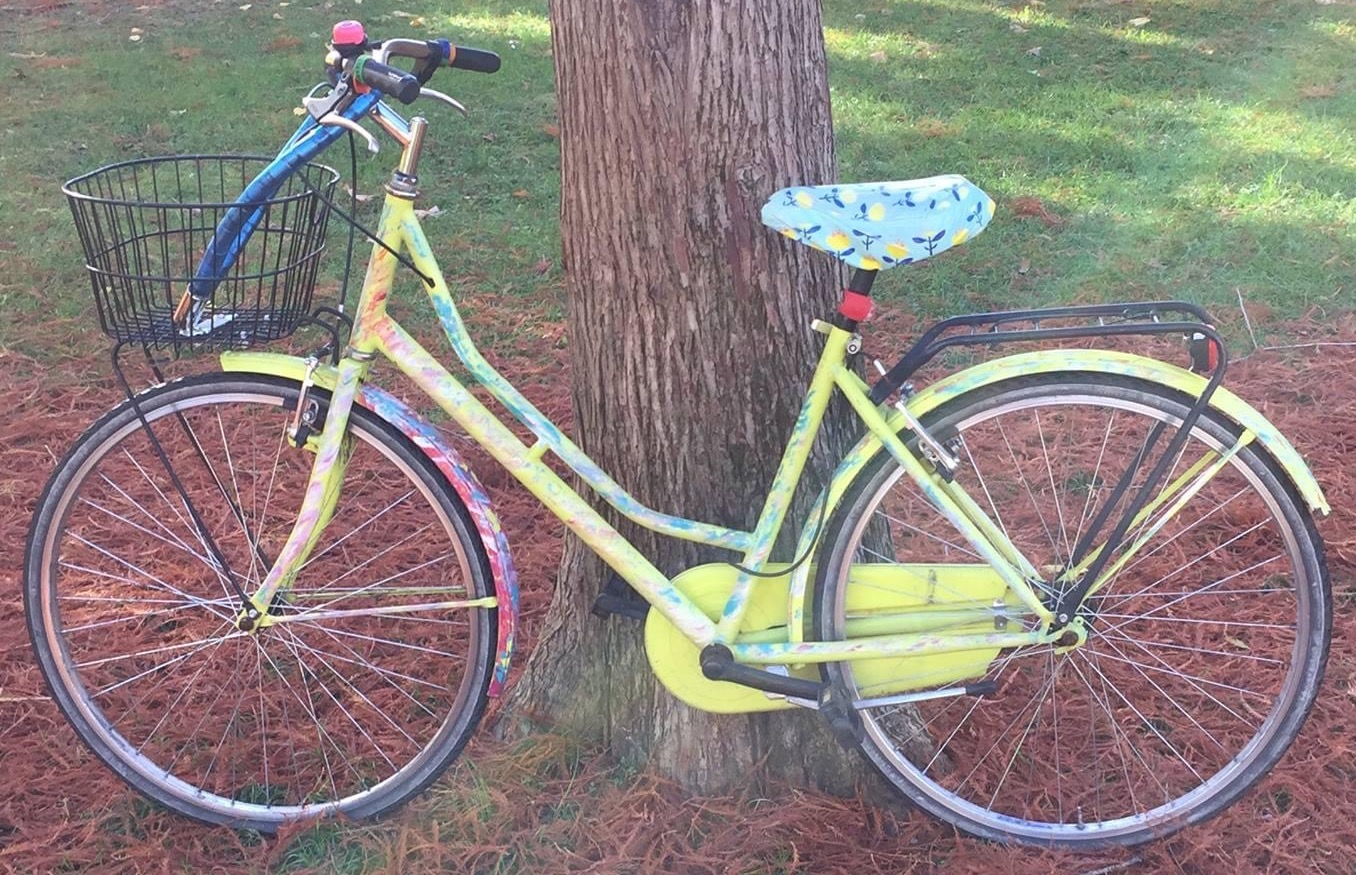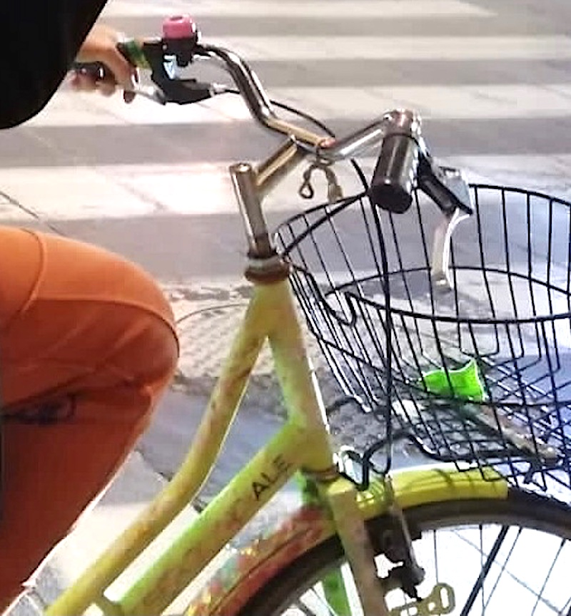 descrizione / segni particolari: Bici telaio da donna giallo acido con spruzzi colorati fatti con spray, cestino e sella neri, portapacchi, sul telaio ci sono le iniziali ALE in nero, c’è un elastico del gay pride sul manubrio, campanello rosa modello Tiger