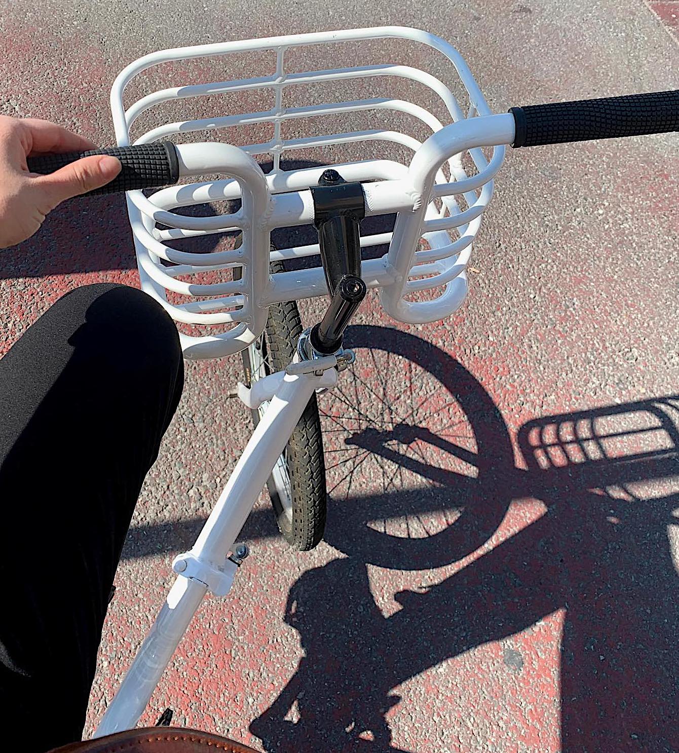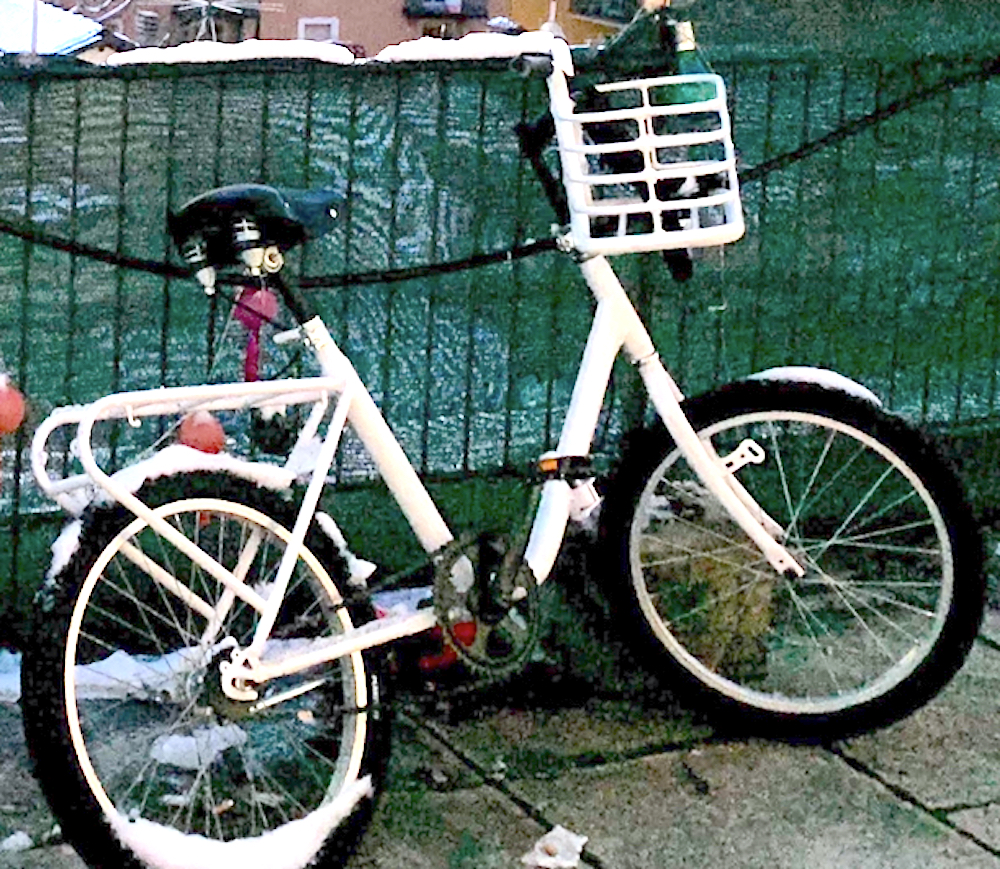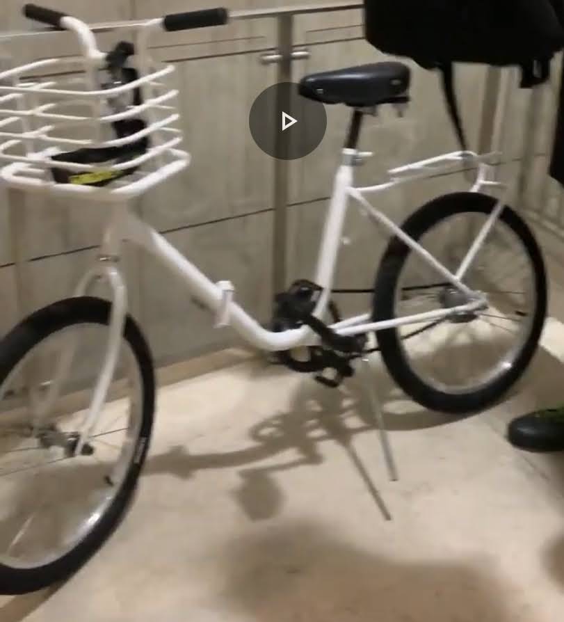 bici pieghevole, telaio bianco con cestino e portapacchi incorporati, ruote piccole con gomme tutte nere, sellino nero a molla con borchie, manopole nere, freni contropedale, senza carter catena