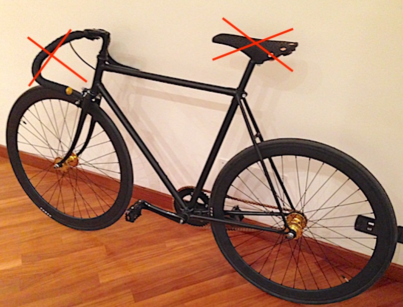 descrizione / segni particolari: Bici a scatto fisso costruita su vecchio telaio da corsa colore nero opaco senza scritte; Particolari di colore oro: catena, mozzi ruote; Freno solo anteriore; Cerchi neri profilo alto; Pedali neri lucidi; DIVERSA DA FOTO: Manubrio da città curvo nastrato nero con borchie oro; sella marca BRN con foro anatomico