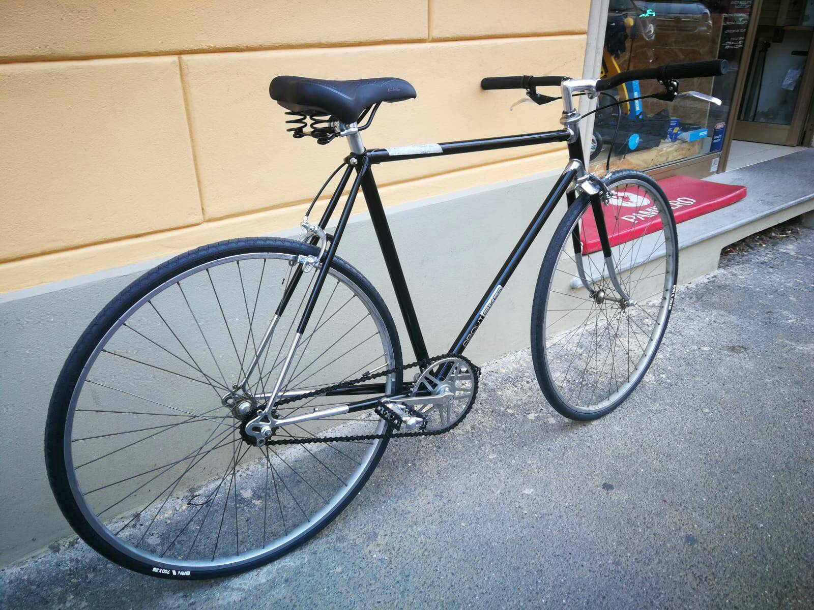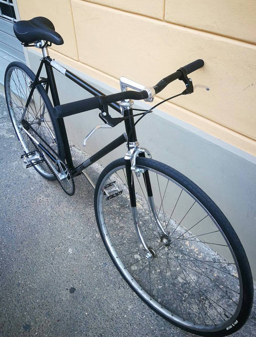 City bike senza cambio, telaio nero con le forcelle e giunture cromate e con la scritte ABOUT BIKES, sellino nero a molla, manubrio nero dritto