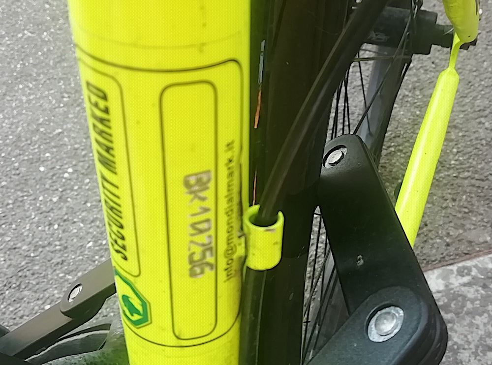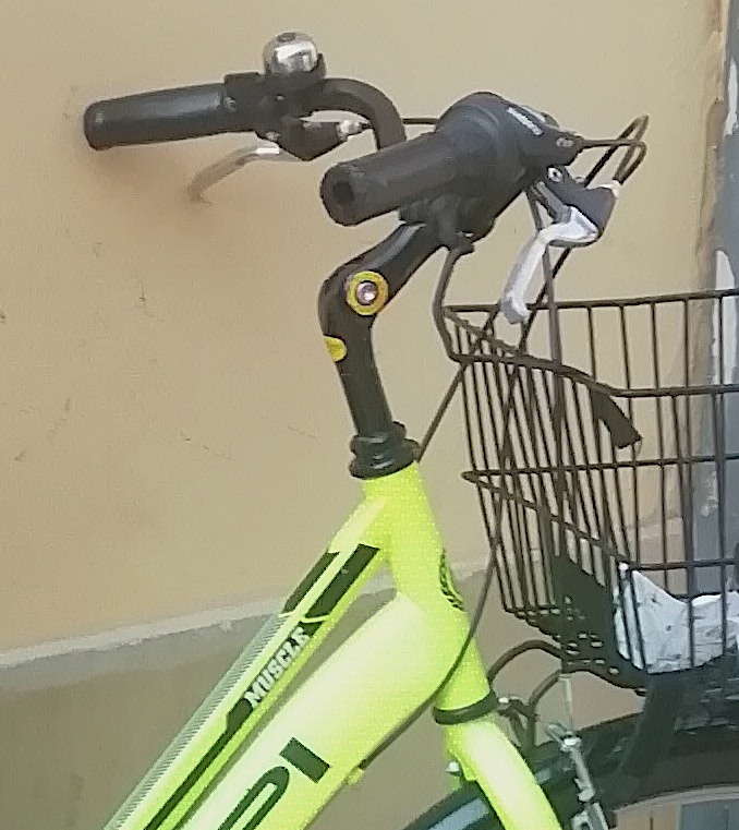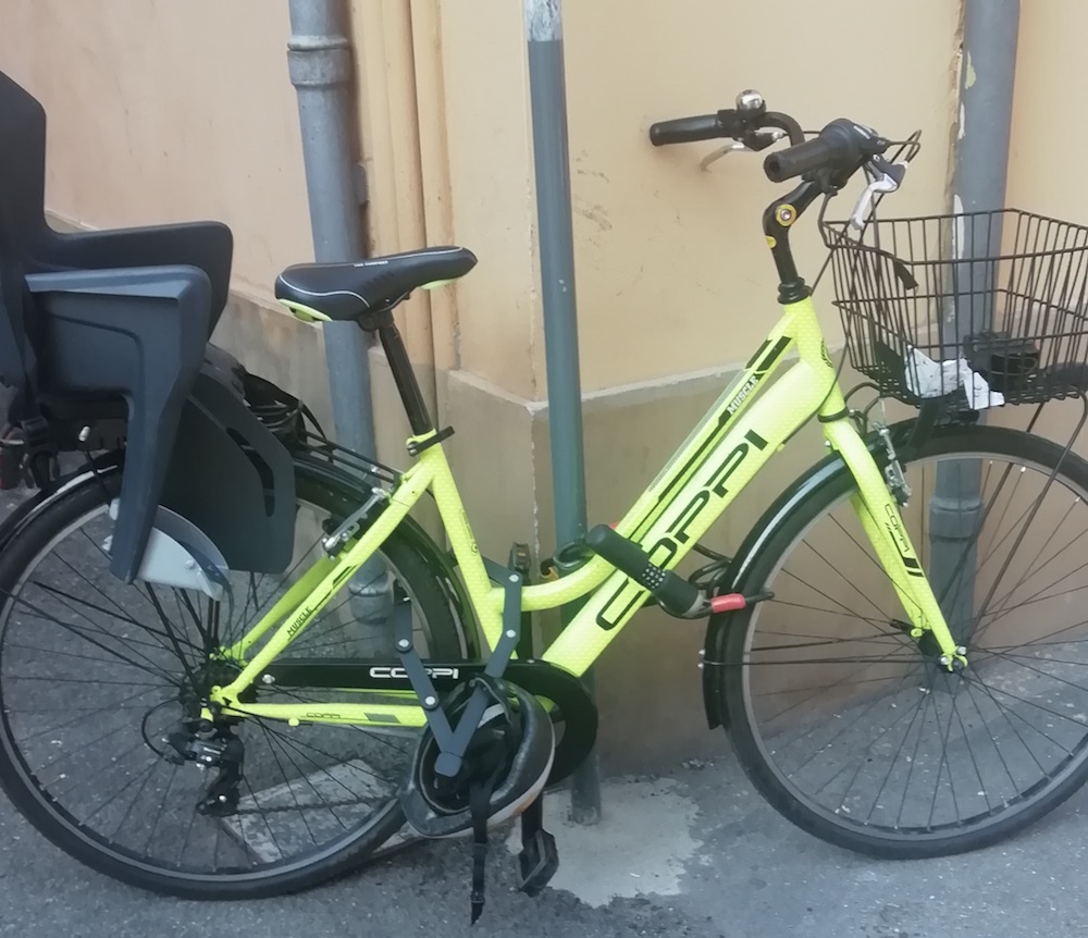 City bike con cambio, telaio giallo fluorescente con le scritte COPPI in nero, e MUSCLE in bianco, telaio marchiata con codice, carter catena e parafanghi neri, due portapacchi neri, cestino anteriore
