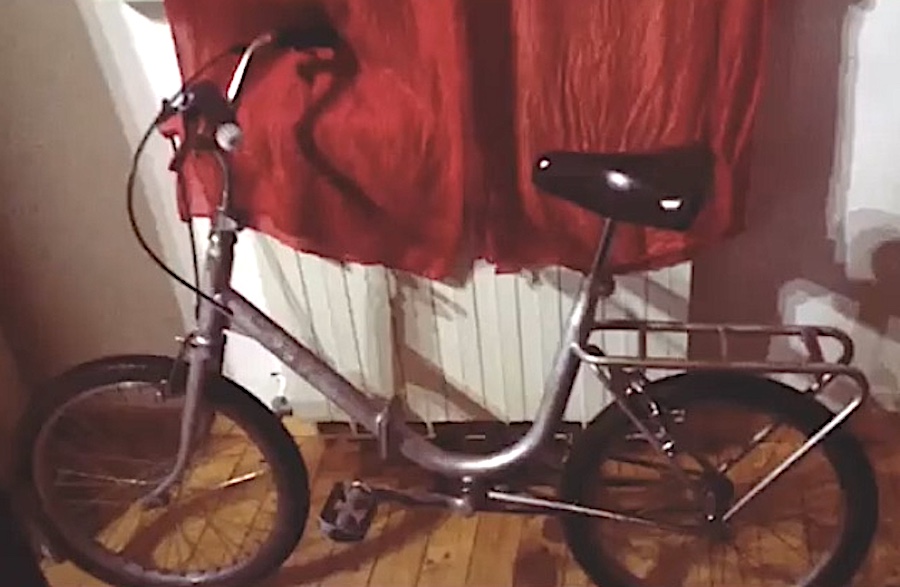 Vecchia bici pieghevole tipo graziella, telaio argento senza scritte leggibile, portapacchi integrato
