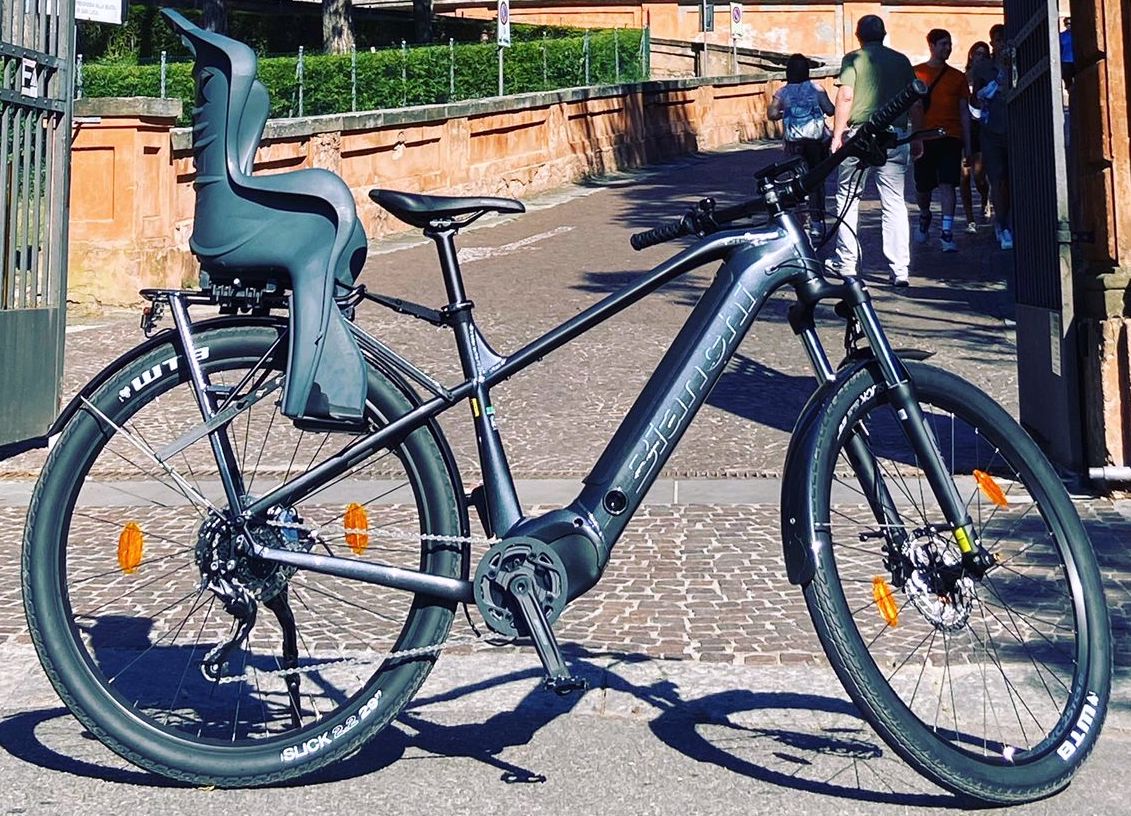 Bici elettrica, telaio nero con le scritta BIANCHI, forcella anteriore ammortizzata, freni a disco, portapacchi anteriore, seggiolino posteriore per bambino