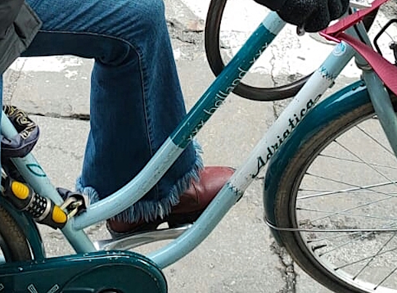 descrizione / segni particolari: City bike da donna, telaio verde e bianco con la scritta ADRIATICA in verde e HOLLAND in bianco, copertoni bianchi, cestino anteriore bianco , manopole del manubrio bianche, tre mulini disegnati sul copricatena verde scuro smeraldo, fanale anteriore e campanello d'acciaio
