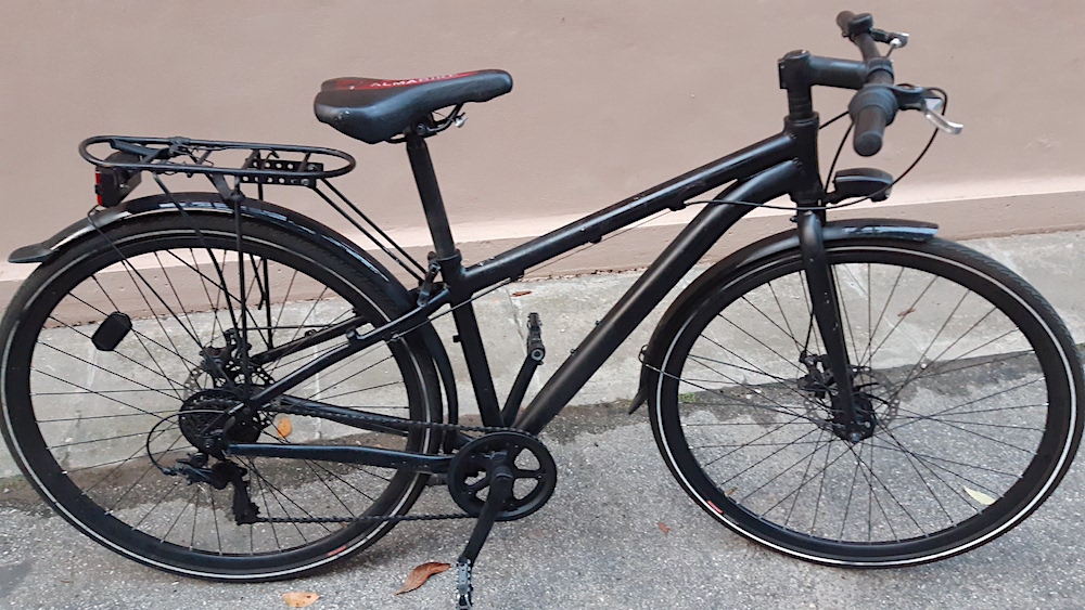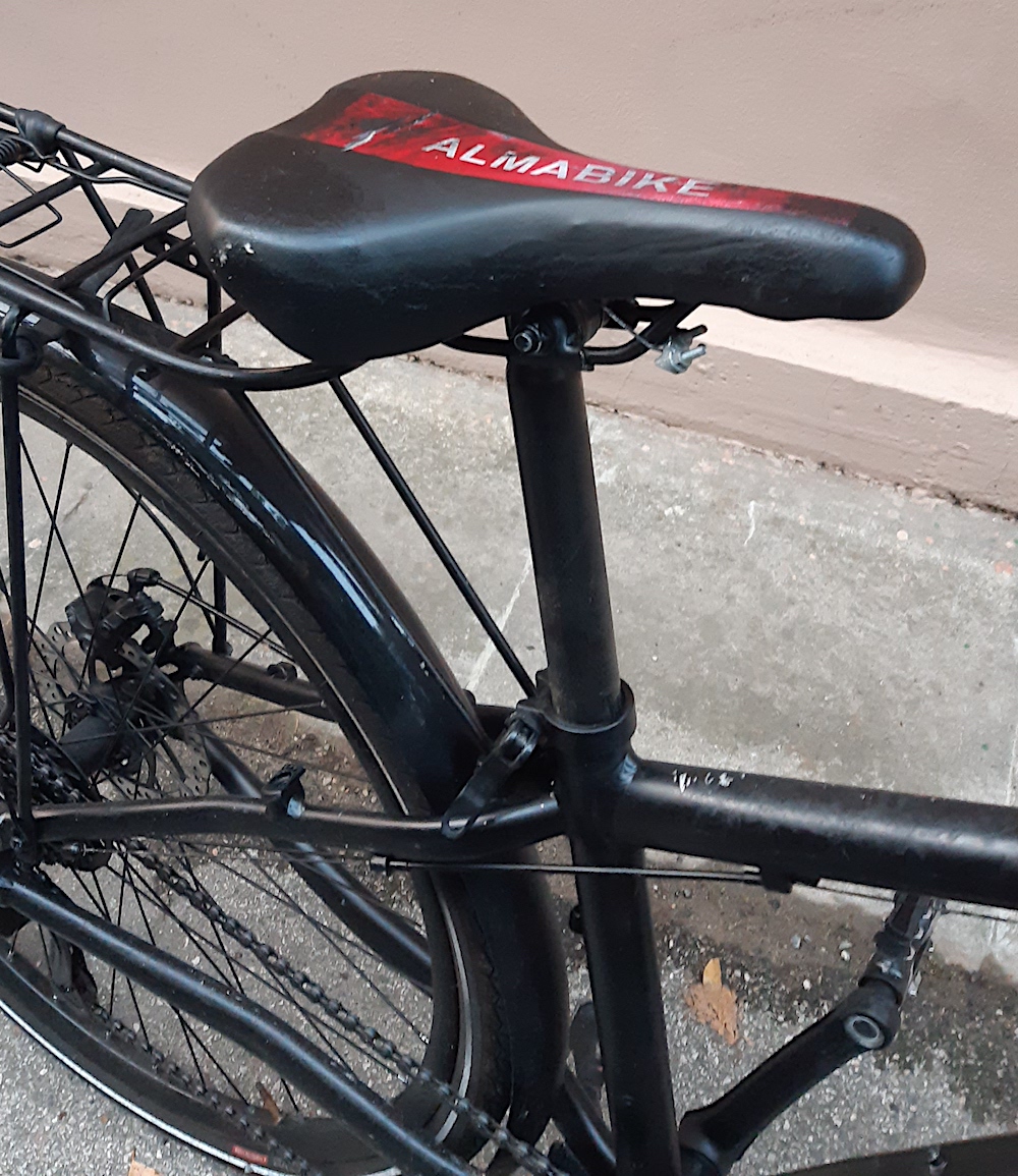 AlmaBike n. 179 riverniciata di nero dopo un furto precedente, sellino nero con la scritta ALMABIKE e un taglio in orizzontale, freni a disco