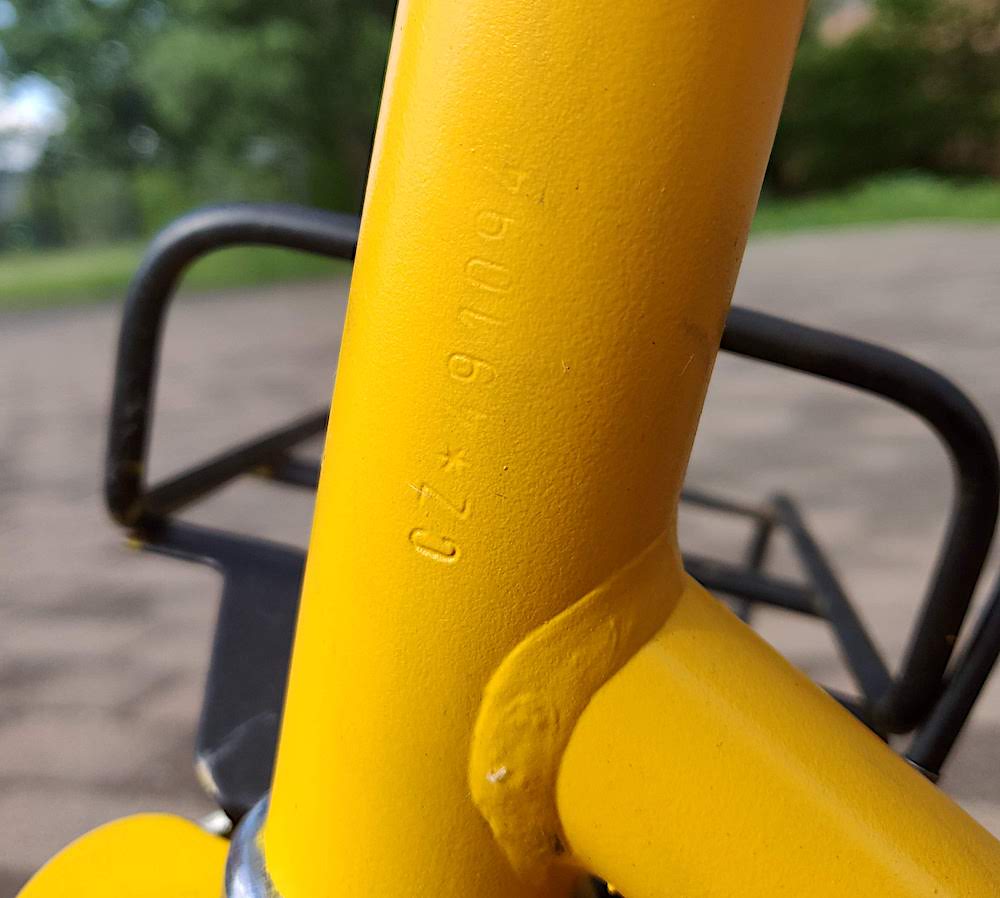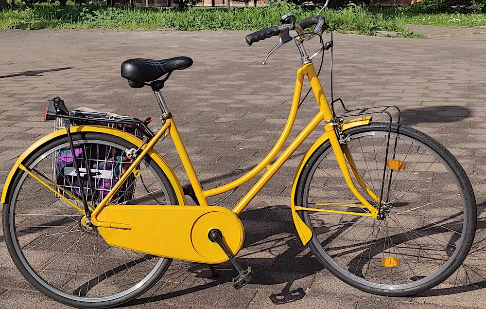 city bike, telaio riverniciato giallo un po'rovinata, 2 portapacchi neri, cestino anteriore, carter catena chiuso e parafanghi gialli