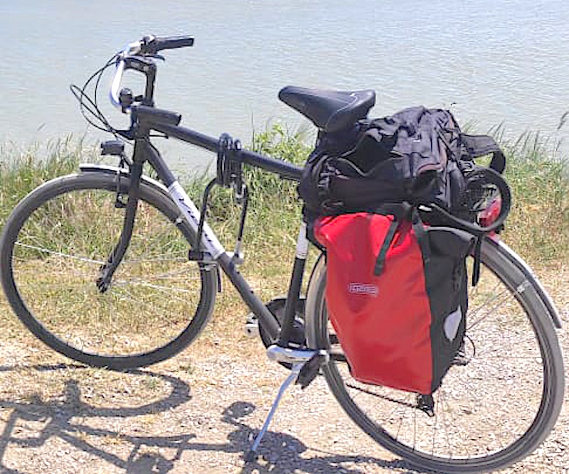 City bike da uomo con cambio, telaio nero satinato con le scritte VICINI e PARISIENNE, edizione limitata (tricolori), cerchi neri, portapacchi posteriore nero, copricatena, parafanghi, luce USB