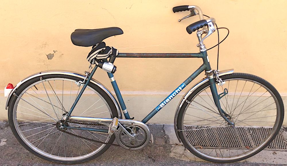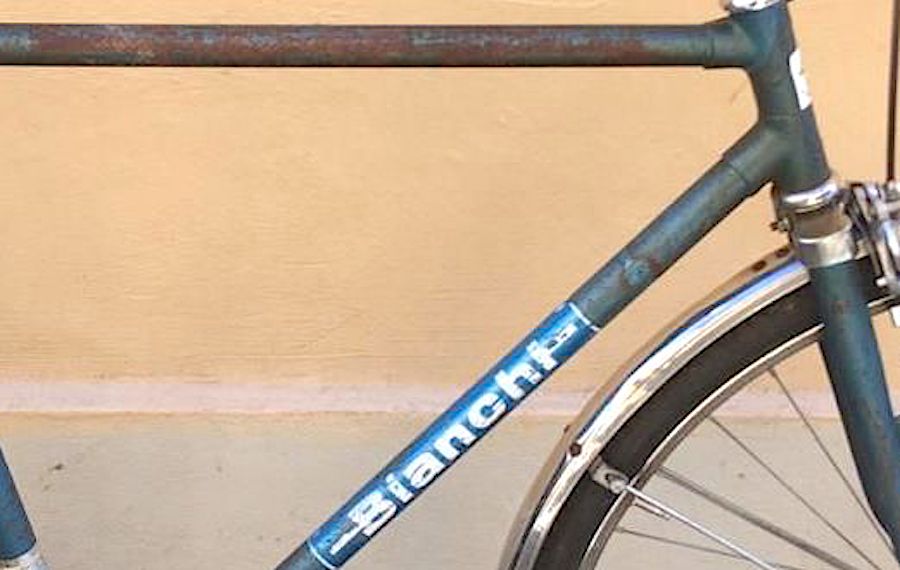 city bike da uomo, telaio azzurro con la scritta BIANCHI in bianco e la canna arrugginita, sellino nero in buono stato, parafanghi e copricatena cromati, pedali colore bianco