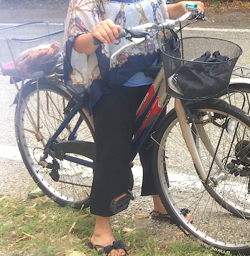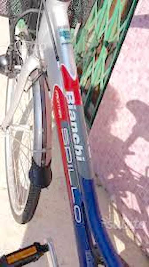 descrizione / segni particolari: City bike da donna con cambio, telaio colore blu e argento con decorazioni rosse e grigio scuro sul tubo obliquo e le scritte Bianchi Spillo in bianco, due cestini: anteriore nero, posteriore grigio, cestino anteriore danneggiato, carter copricatena artigianale in colore nero, copertoni marca B-Twin Trekking