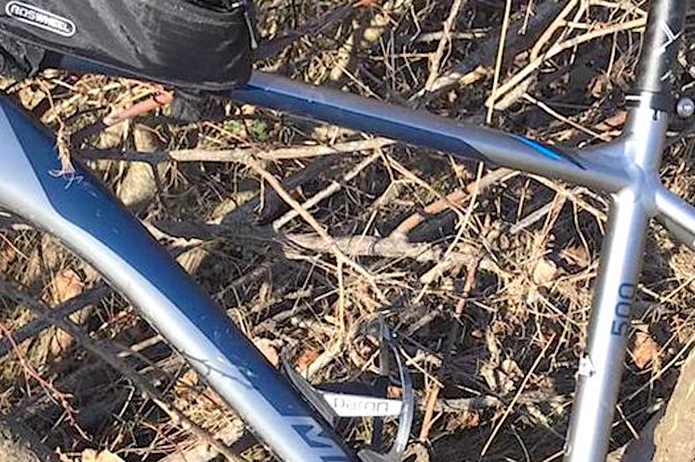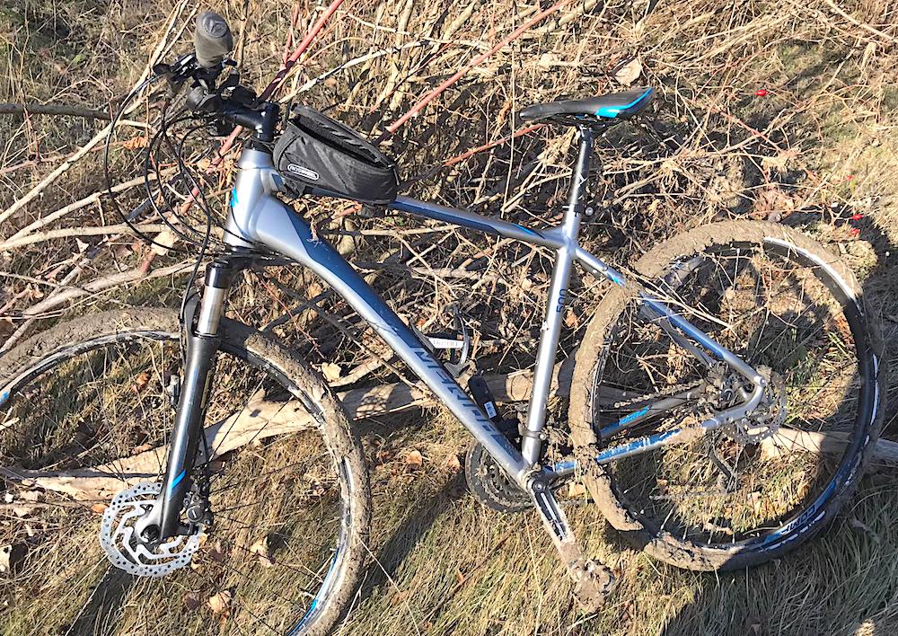 mountain bike, telaio grigio con la scritta MERIDA, forcella anteriore ammortizzata, freni a disco, ruote da 29", portaoggetti su cannone principale, malfunzionamento marce basse