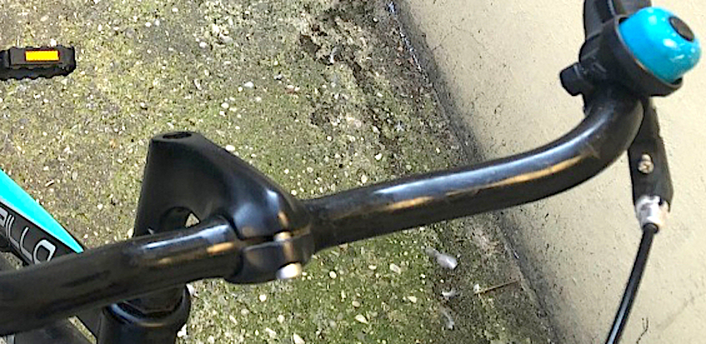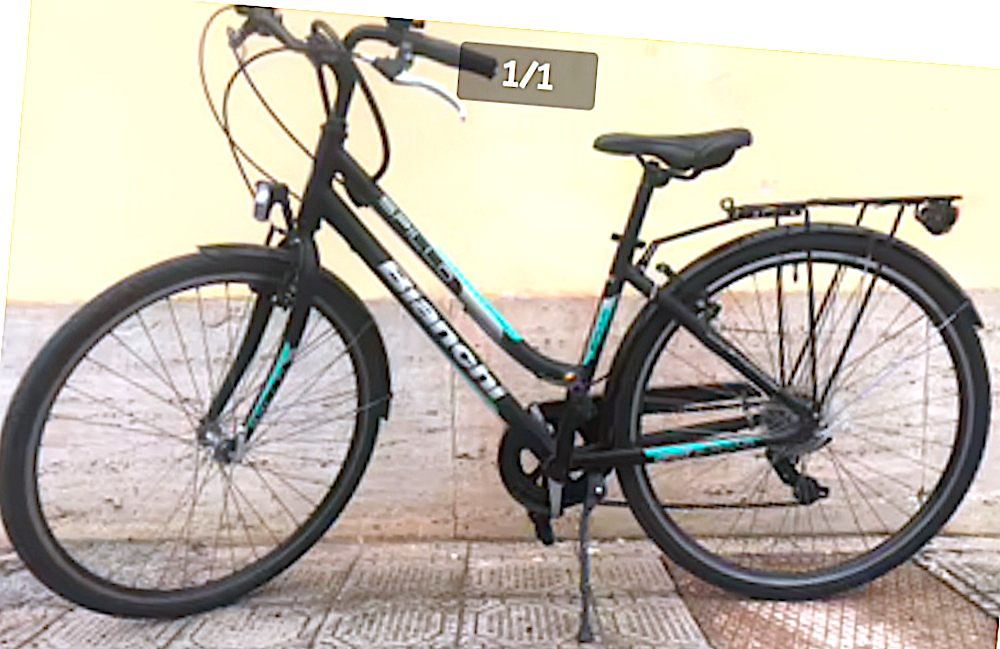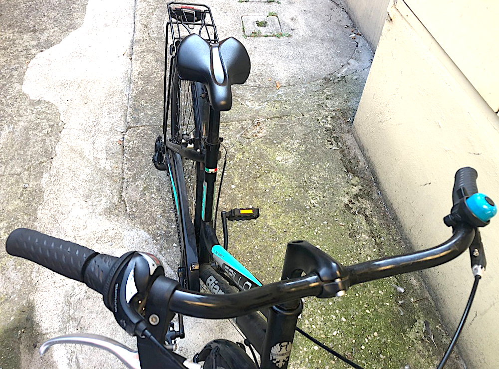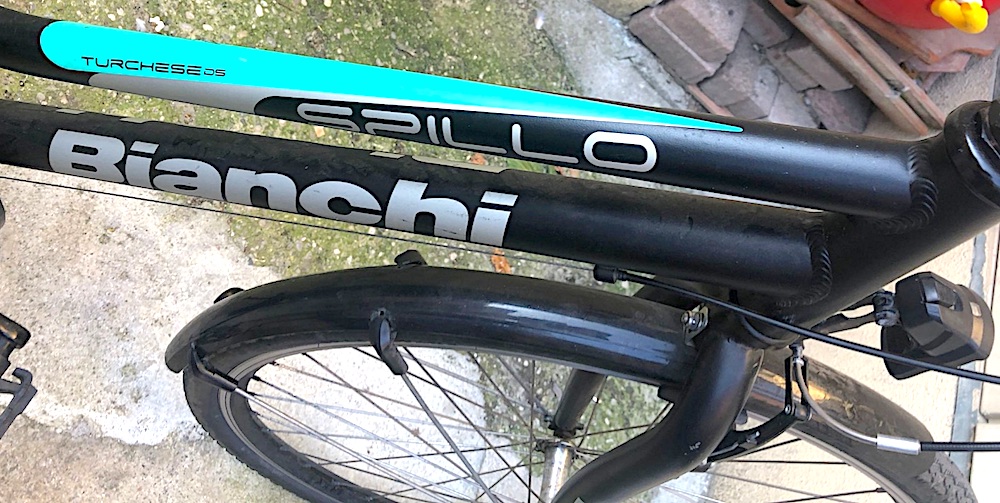 City bike da donna con cambio, telaio nero con dettagli in azzurro e con le scritte BIANCHI e SPILLO in argento, campanello blu