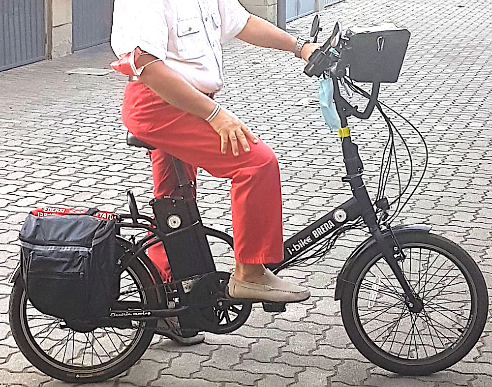 descrizione / segni particolari: Bici pieghevole elettrica, telaio nero con le scritte i-BIKE BRERA in bianco, batteria soto la sella, aggiunti due specchietti non di serie, un borsello anteriore con dentro varie cose (bandane, occhiali rossoneri, chiave di due lucchetti), borse posteriori con carica batteria e caschetto arcobaleno, un pin bike montato nella ruota anteriore (magnete e sensore)