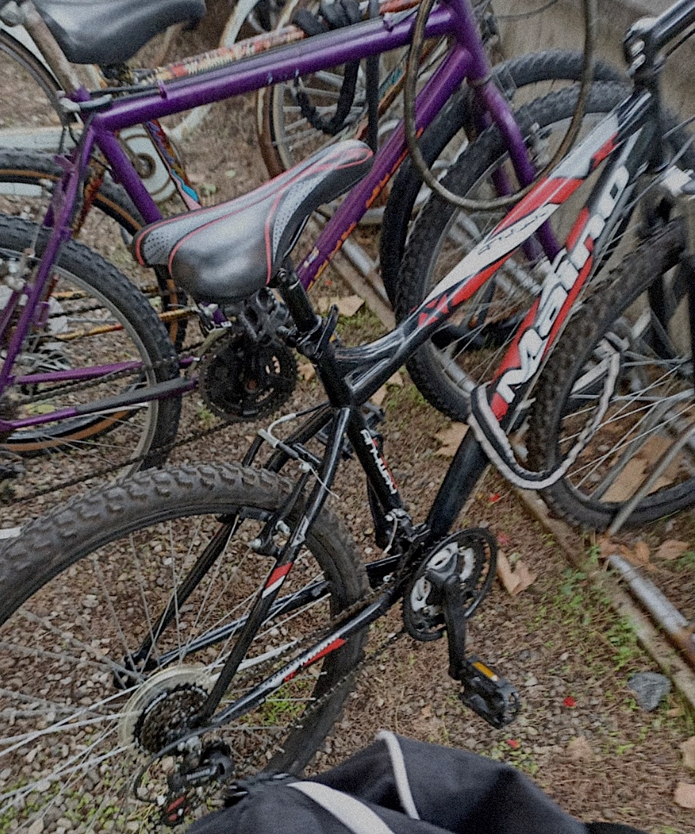 Mountain bike, telaio nero e rosso con le scritte MAINO in bianco, forcella anteriore ammortizzata, manubrio rosso, ruote da 26", funzionava perfettamente apparte lo sterzo un po' lento.