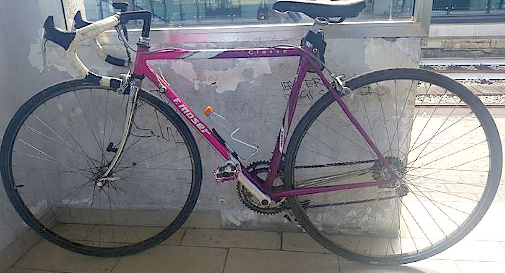 descrizione / segni particolari: Bici da corsa, telaio di taglia piccola 48-49cm circa colori viola e rosa con le scritte MOSER e CLASSE in bianco una striscia bianca in mezzo, sbucciature del colore in diversi punti del telaio, Forcella anteriore cromata, attacco manubrio nero,