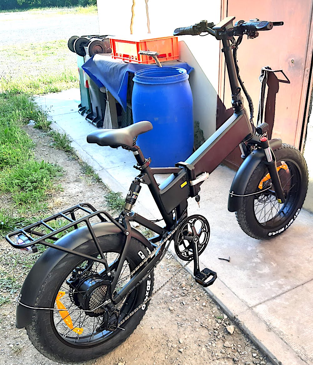 descrizione / segni particolari: Bici pieghevole elettrica stile fat bike, copertoni grossi marca CST, telaio nero, doppio ammortizzata, freni a disco, cestino nero posteriore, motore marca Bafang nel mozzo della ruota posteriore, ammortizzatore centrale marca HLT