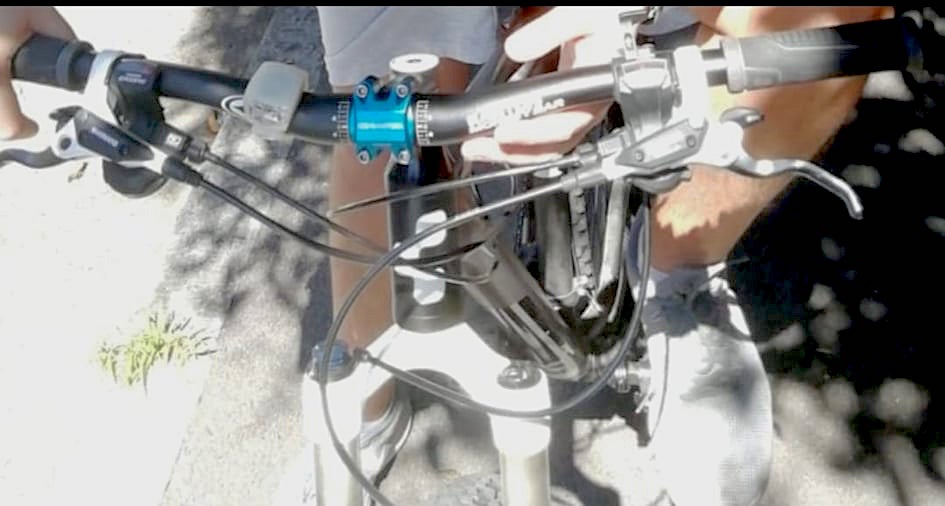 Bici nuova (2021-11), telaio nero con striscia bianca, freni bianchi, portavivande (portapacchi?), forcella anteriore ammortizzata, freni a disco